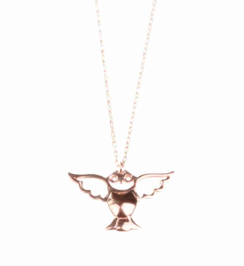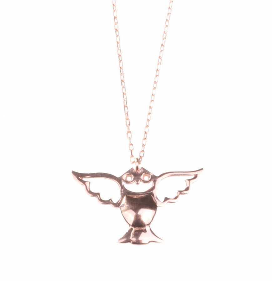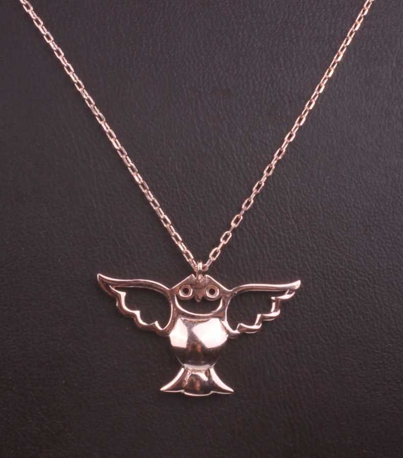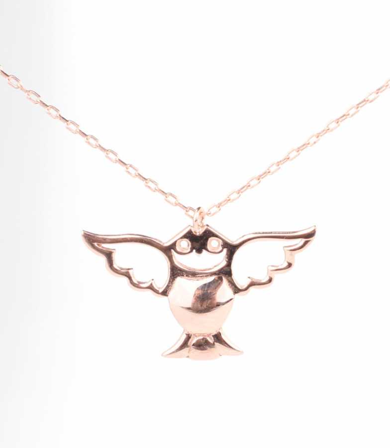 Gümüş kolye 925 ayar gümüşten yapılmıştır. Uçan Baykuş şeklindeki kolye 2,5 cm boyutlarındadır. Zinciri 45 cm uzunluğundadır ve taşsızdır. Rose(Pembe) rodajlıdır. Ağırlığı 1,93 gramdır.