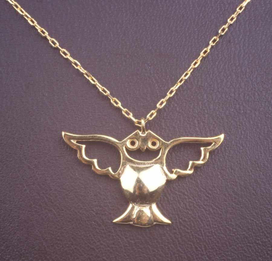 Gümüş kolye 925 ayar gümüşten yapılmıştır. Uçan Baykuş şeklindeki kolye 2,5 cm boyutlarındadır. Zinciri 45 cm uzunluğundadır ve taşsızdır. Sarı rodajlıdır. Ağırlığı 1,93 gramdır.