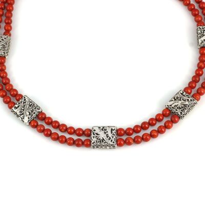925 Ayar Gümüş Mercan Taşlı Gümüş Ajurlu Parçalı Kolye