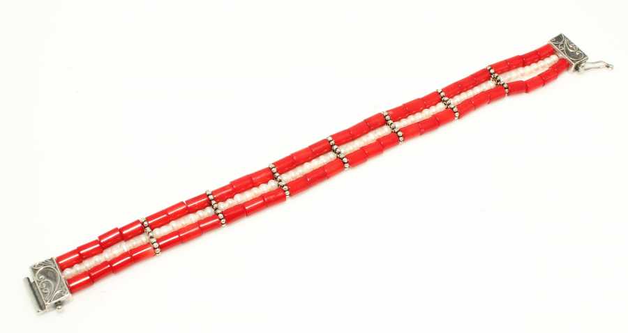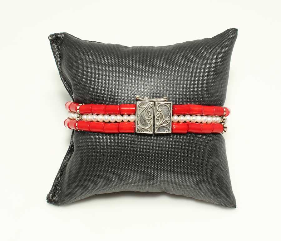 Bileklik 925 ayar gümüşten imal edilmiştir. Taşlı dizi bileklik 19 cm uzunluğundadır. Gümüş bileklik 0,4 cm'ye 0,6 cm ebatlarında mercan taşlar ve ortasında inci taşlar şeklinde 3 sıra dizayn edilmiştir. Bileklik mercan ve inci taşlarından oluşmaktadır. Gümüş bileklik 21,26 gram ağırlığındadır.