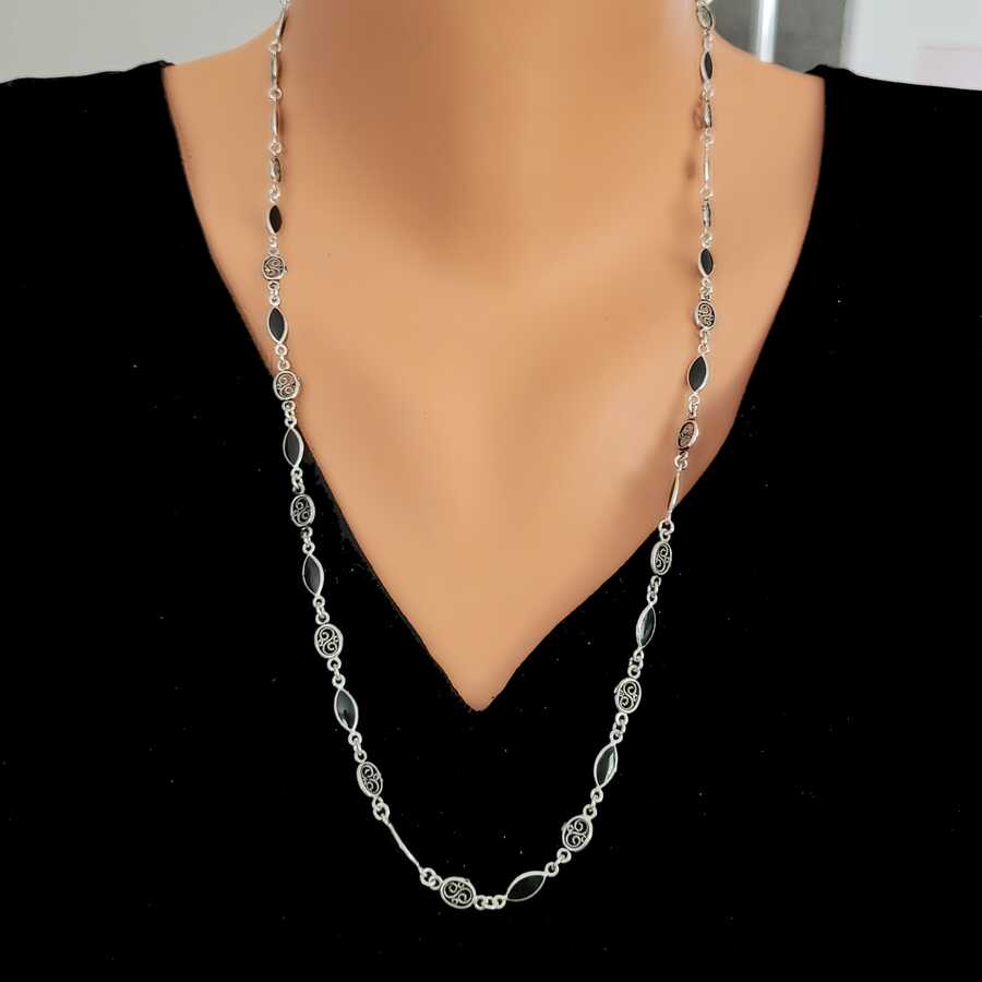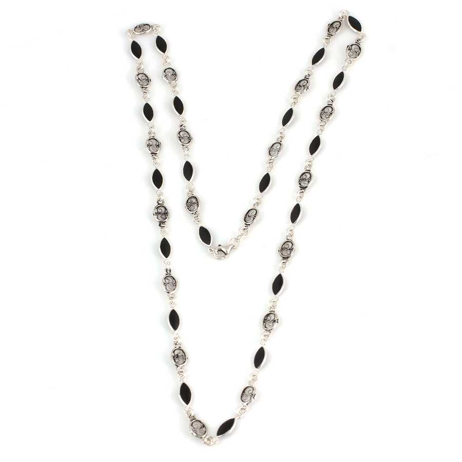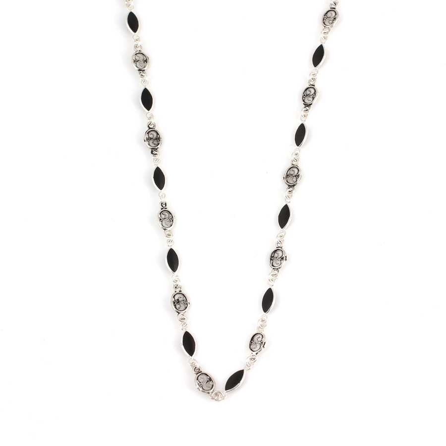 Gümüş kolye 925 ayar gümüşten yapılmıştır. Telkari kolye 55 cm uzunluğundadır. Kolye siyah minelidir. Ağırlığı 11,1 gramdır.