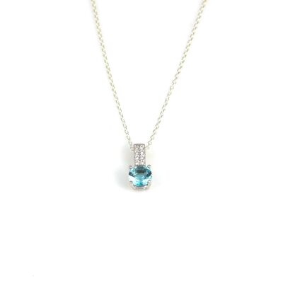 Gelince Haber Ver Gümüş kolye 925 ayar gümüşten yapılmıştır. Zarif gümüş kolye tepeliği dahil 1,4 cm'ye 0,6 cm boyutlarındadır. Zirkon taşı 0,6 cm boyutlarındadır. Gümüş kolye 45 cm uzunluğundadır. Kolye akuamarin renk zirkon taşlıdır. Ağırlığı 2,28 gramdır.