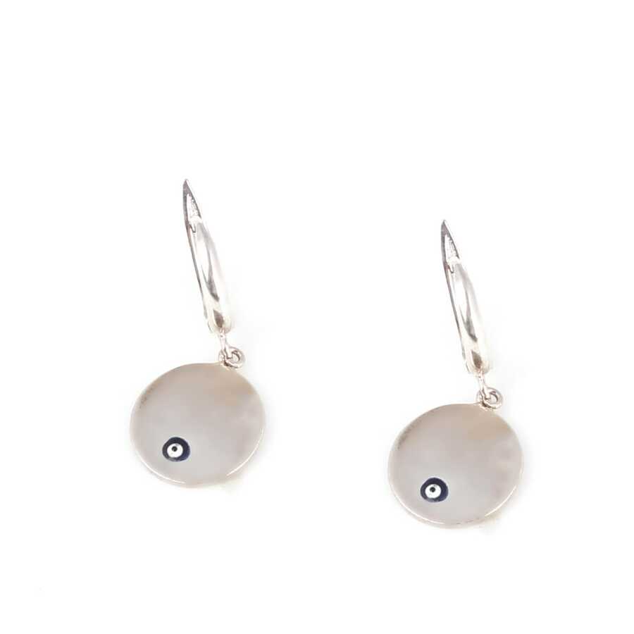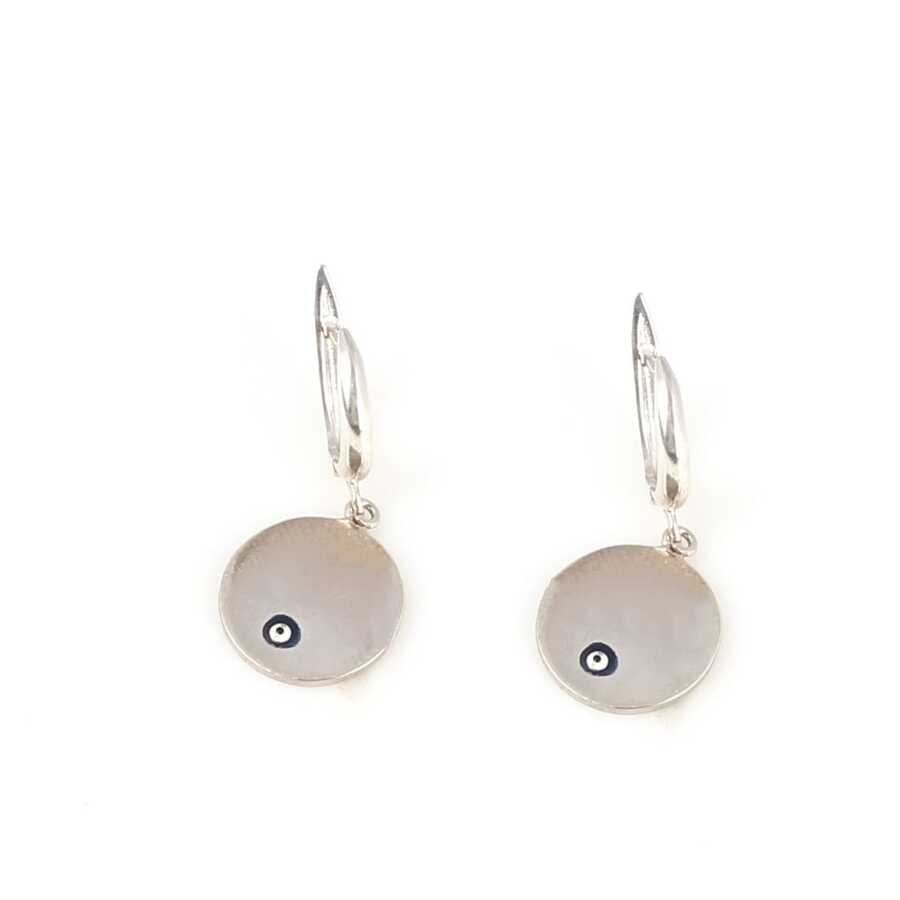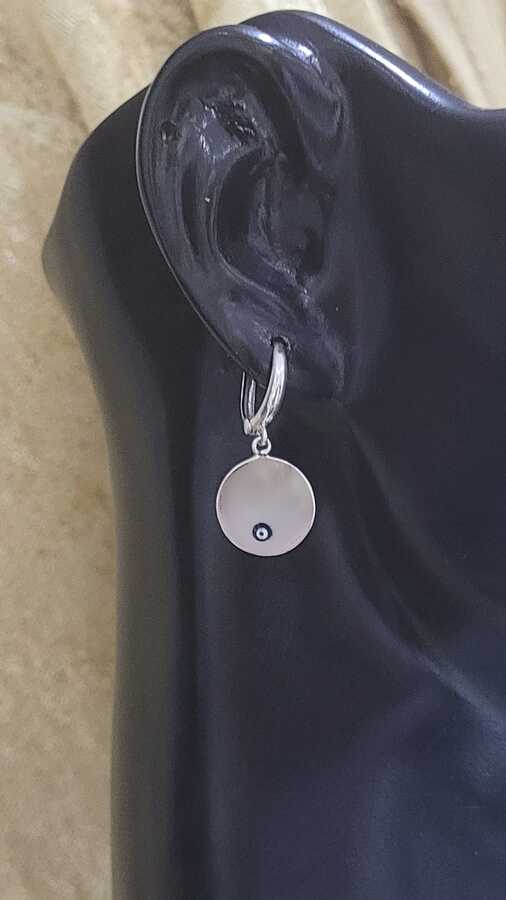 Gümüş küpe 925 ayar gümüşten yapılmıştır. Sallantılı yuvarlak plaka küpe 1,3 cm'ye 2,9 cm boyutlarındadır. Küpe taşsızdır. Küpenin köşesinde minik nazar boncuğu vardır. Ağırlığı 4,07 gramdır.