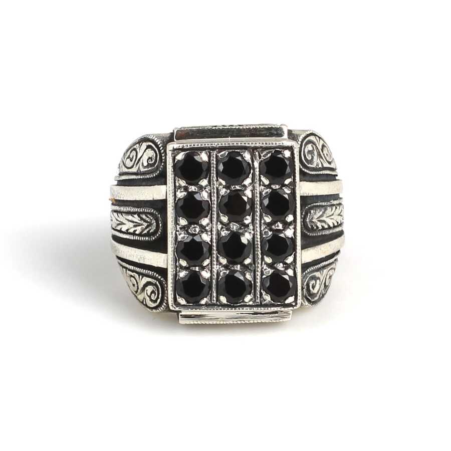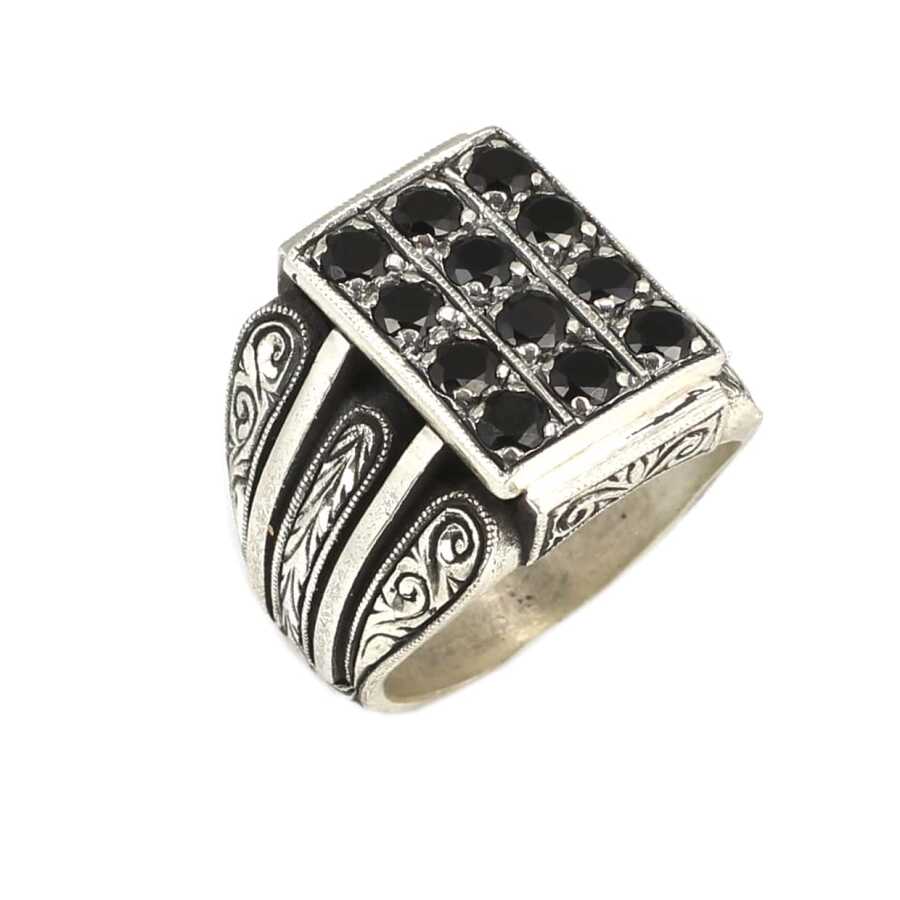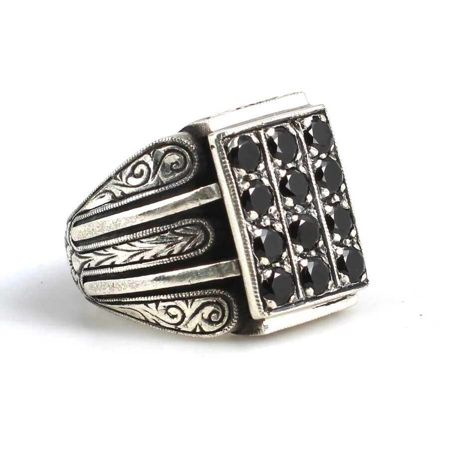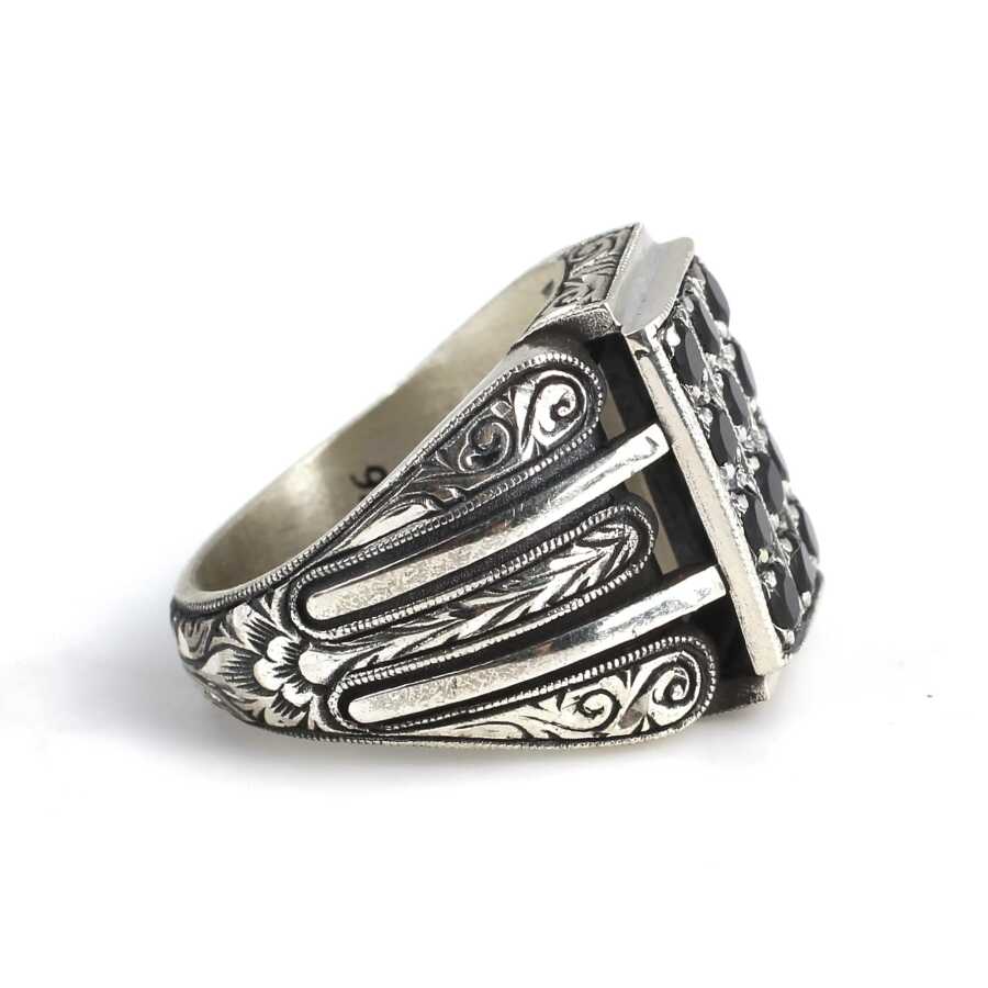 925 ayar gümüştür. Gümüş erkek yüzüğün üst kısmı 2,0 cm'ye 1,9 cm boyutlarındadır. Resimdeki yüzüğün ölçüsü 24,5 ölçüdür. Yüzük siyah zirkon taşlıdır. Gramı: 20,3 gr