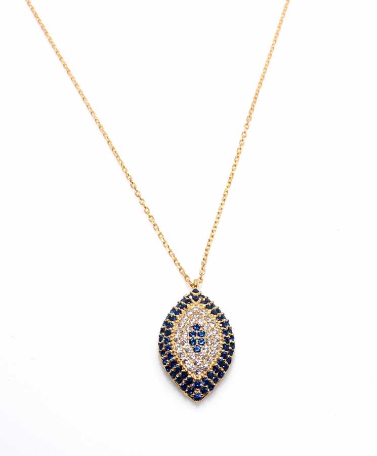 Gümüş kolye 925 ayar gümüşten yapılmıştır. Badem şeklindeki nazar boncuğu kolye 1,4 cm'ye 2,4 cm boyutlarındadır. Zinciri 41 cm uzunluğundadır. Kolye zirkon taşlıdır. Ağırlığı 3,05 gramdır.