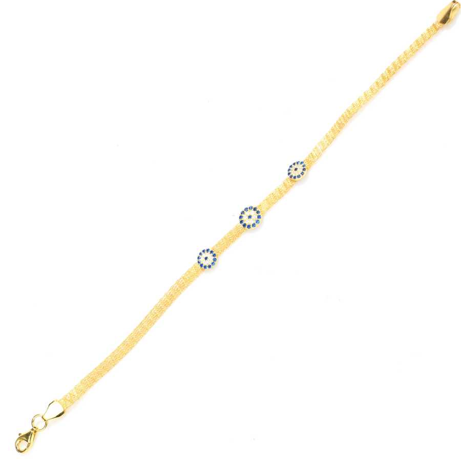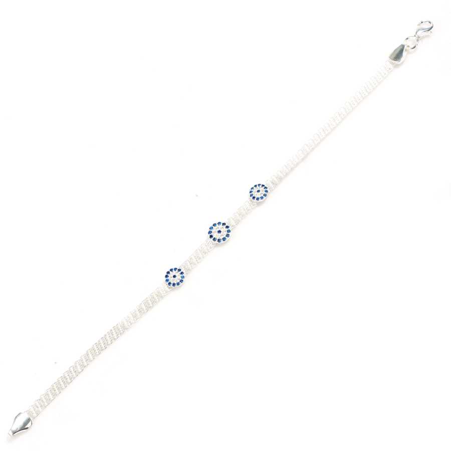 Bileklik 925 ayar gümüş teller ile saç örgüsü gibi örülerek imal edilmiştir. Taşsız 3 sıra örgü bileklik 0,4 cm eninde ve 18 cm uzunluğundadır. Bileklik tamamen el işi ve zirkon taşlıdır. Bileklik üzerinde 3 adet nazar boncuğu vardır. Gümüş bileklik 2,9 gram ağırlığındadır.