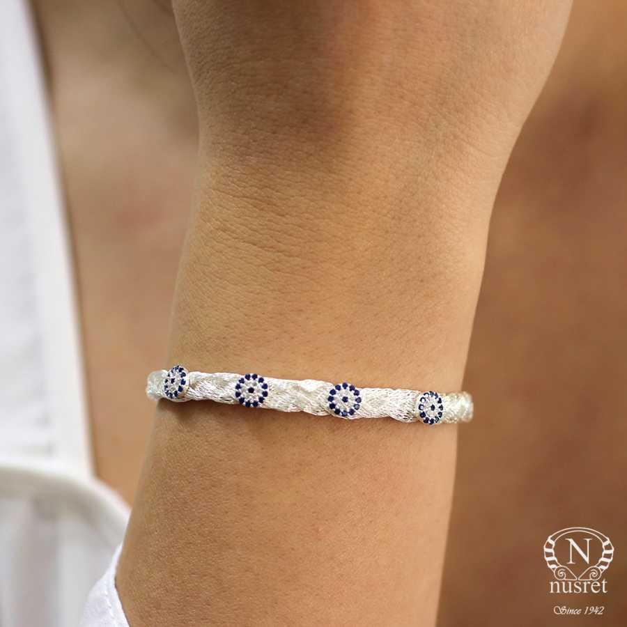 Bileklik 925 ayar gümüş teller ile saç örgüsü gibi örülerek imal edilmiştir. Taşsız 4 sıra örgü bileklik 0,6 cm eninde ve 17 cm uzunluğundadır. Bileklik tamamen el işi ve zirkon taşlıdır. Bileklik üzerinde 4 adet nazar boncuğu vardır. Gümüş bileklik 5,6 gram ağırlığındadır.