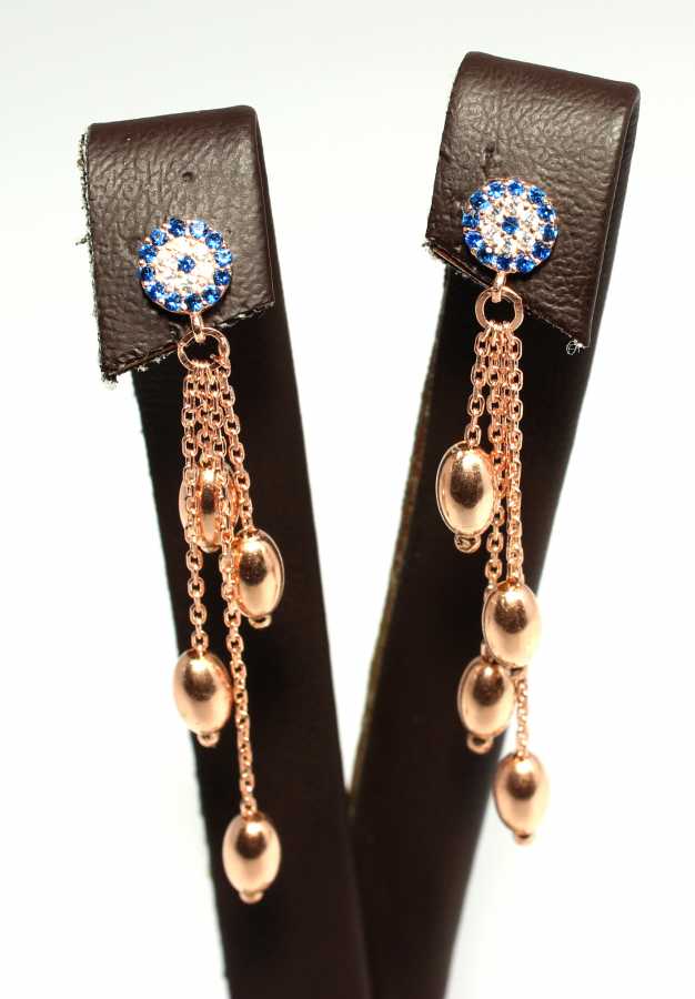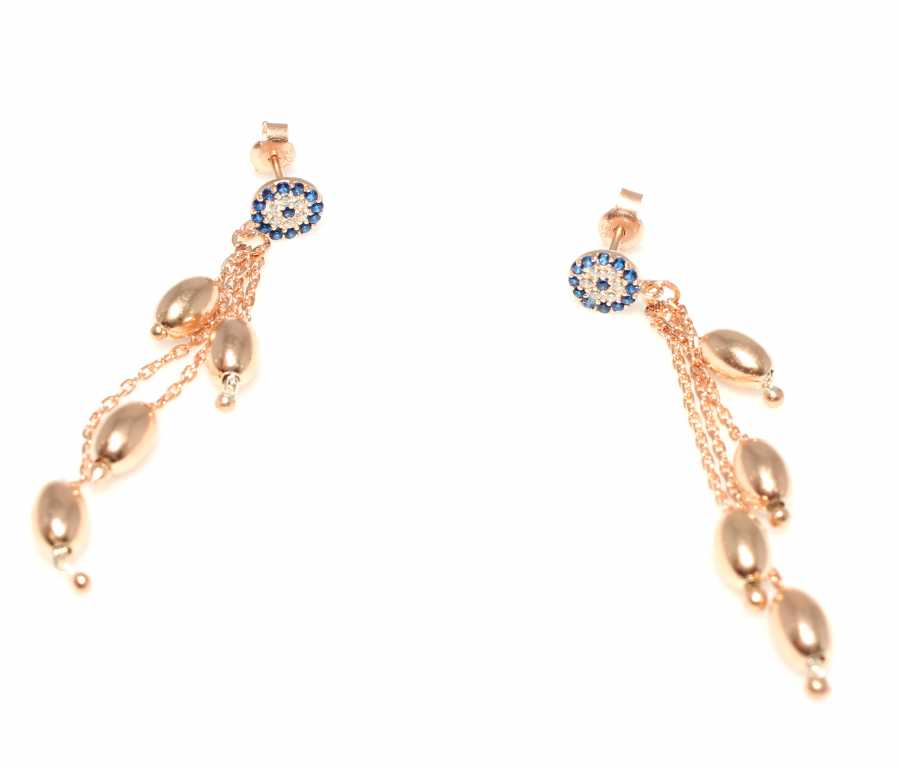 Gümüş küpe 925 ayar gümüşten yapılmıştır. Badem ve nazar boncuk şeklindeki küpe 0,6 cm eninde ve 5,1 cm uzunluğundadır. Küpe zirkon taşlıdır. Nazar boncuk figürü altından sallanan 4 adet zincir ucunda ise badem parçaları vardır. Ağırlığı 3,08 gramdır.