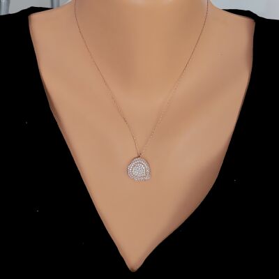 Bu kolye 925 ayar gümüşten yapılmıştır. Kalp şeklindeki kolye 1,7 cm boyutlarındadır. Zinciri 42 cm uzunluğundadır ve taşları beyaz zirkondur. Ağırlığı 2,75 gramdır.
