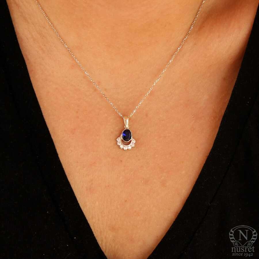 925 Ayar Gümüş Nişane Tasarım Oval Safir Taşlı Kolye