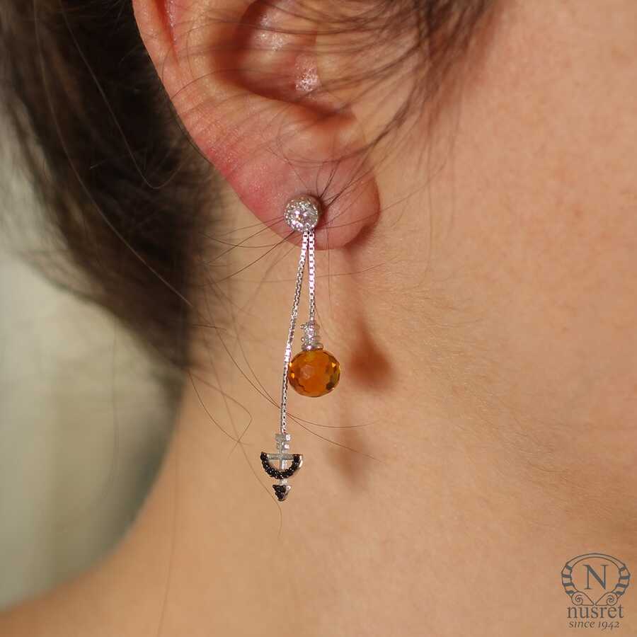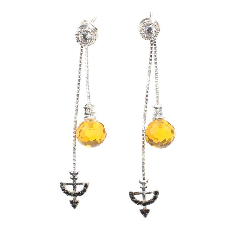 Gümüş küpe 925 ayar gümüşten yapılmıştır. Sallantılı zincirlerle tamamlanan şık küpe 5 cm uzunluğundadır. Küpe sitrin renk swarovski taş ve siyah zirkon taşlıdır. Sitrin renk swarovski taş boyutu: 0,8 cm'dir. Siyah zirkon taşlı ok ve yay şeklindeki parça 0,8 cm'ye 1,1 cm boyutlarındadır. Ağırlığı 4,34 gramdır.
