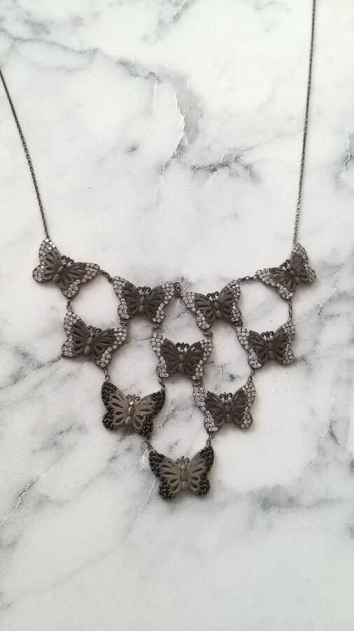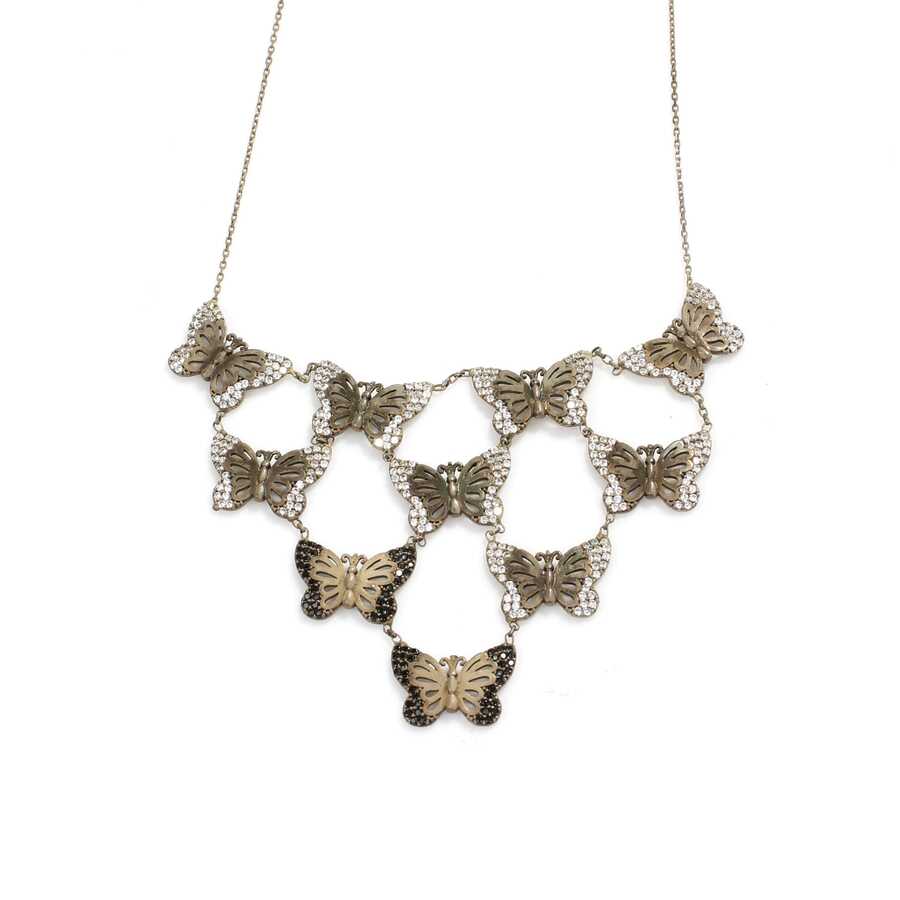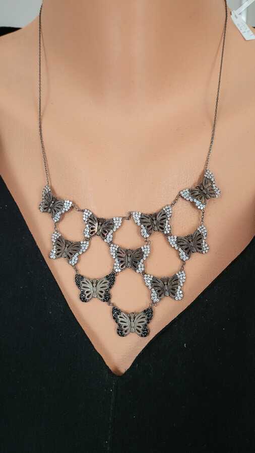 Gümüş kolye 925 ayar gümüşten yapılmıştır. Gümüş kolye 36 cm uzunluğundadır. Kelebeklerin boyutu 1,3 cm'ye 1,8 cm boyutlarında ve 10 adettir. Kelebeklerin kolye 7,5 cm uzunluğundadır. Kolye zirkon taşlıdır. Ağırlığı 13,37 gramdır.
