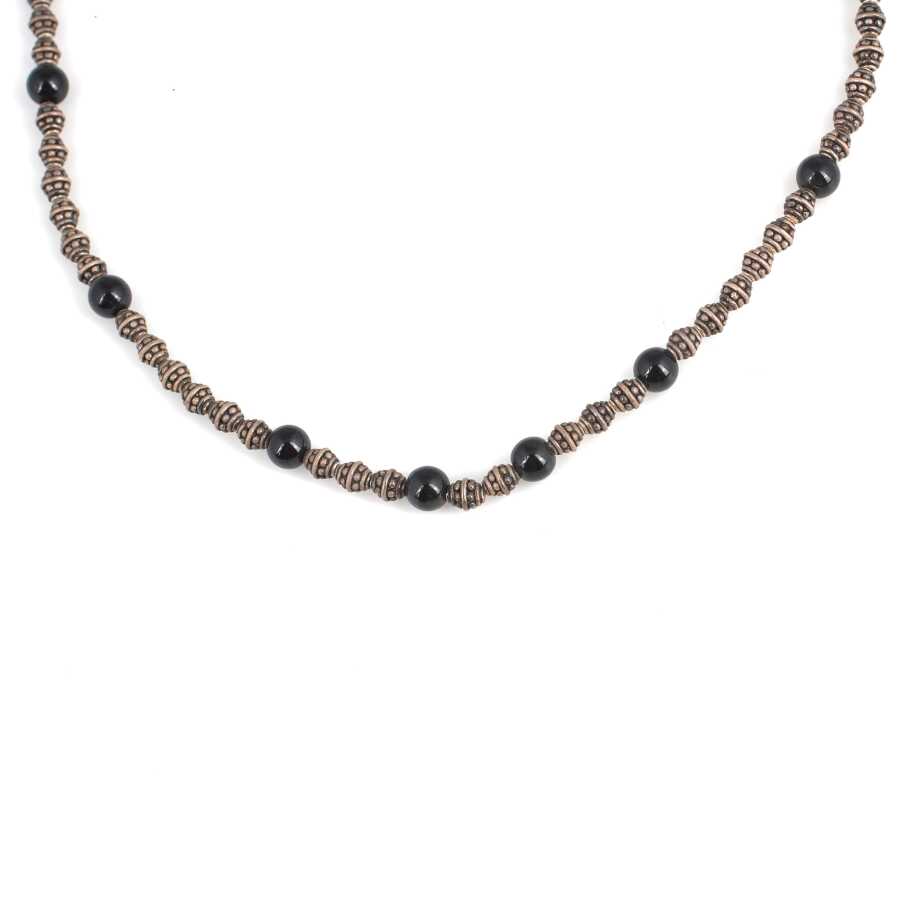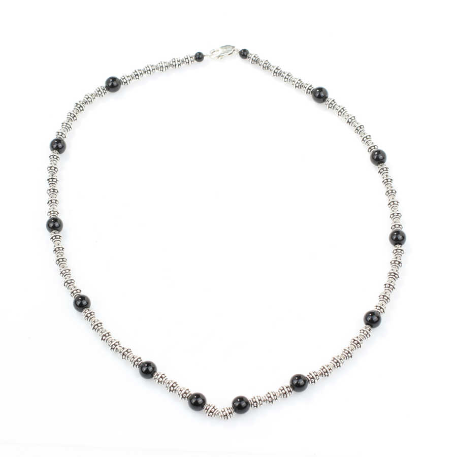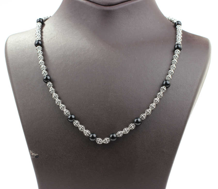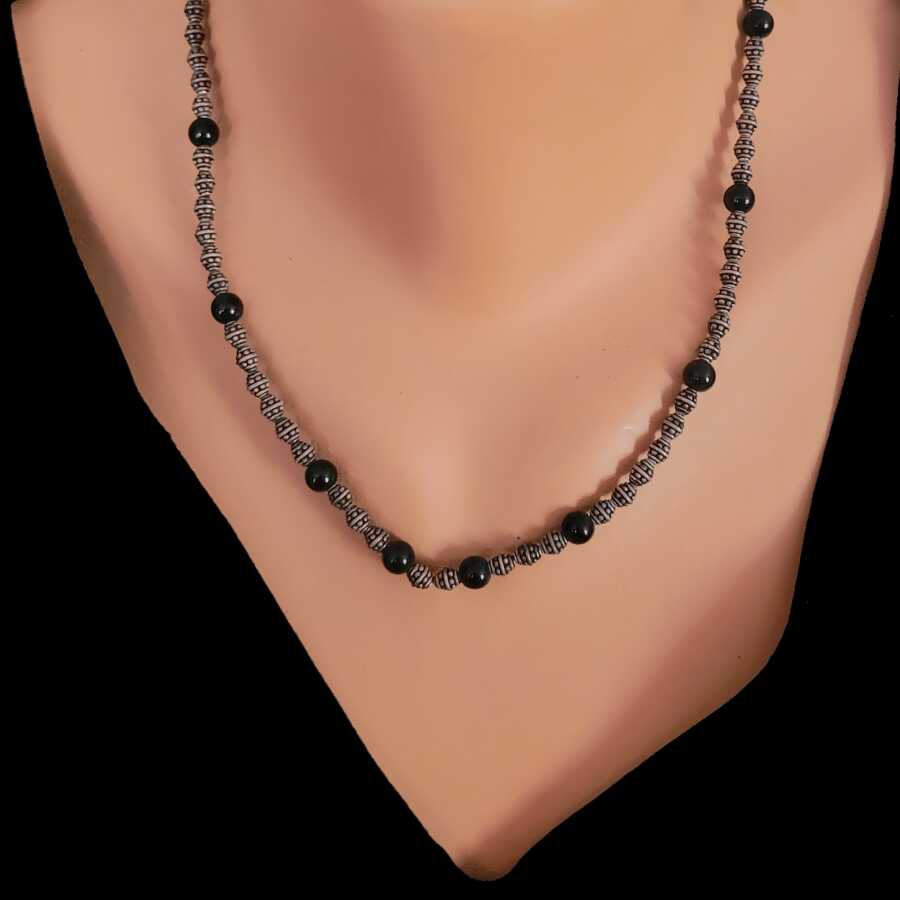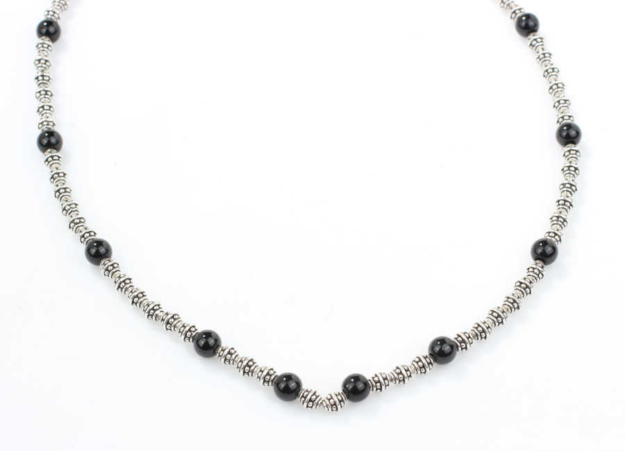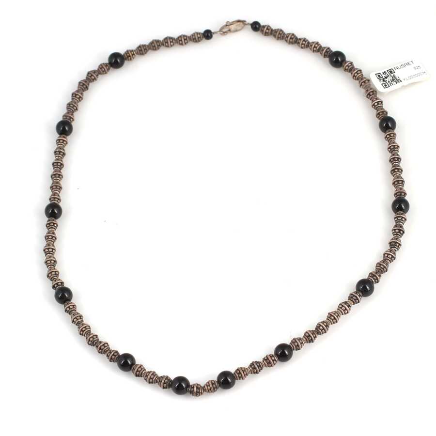 Gümüş kolye 925 ayar gümüşten yapılmıştır. Dizi kolye 46 cm uzunluğundadır. Kolye oniks taş ve gümüş güverseli parçalar eklenerek dizilmiştir. Ağırlığı 37,7 gramdır.