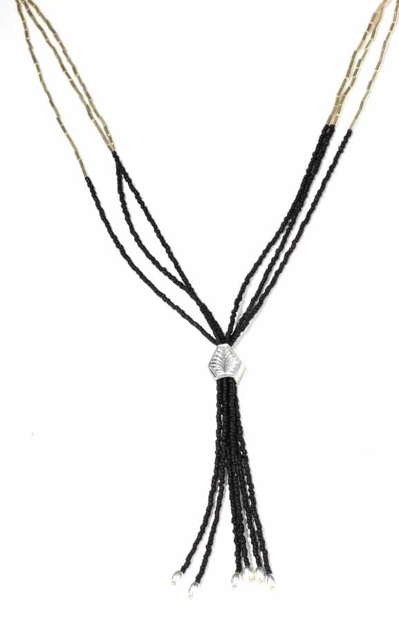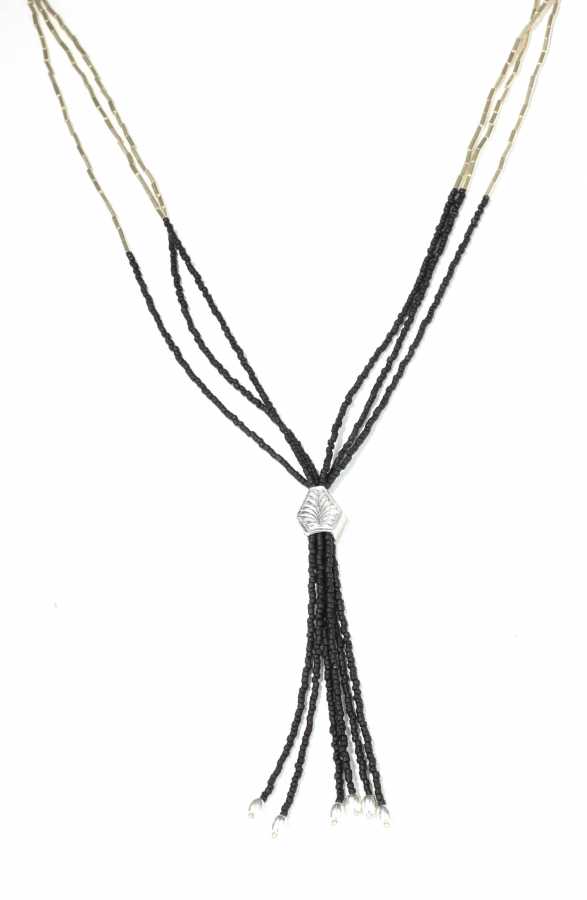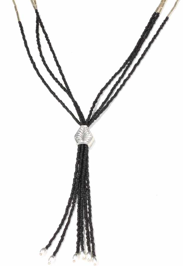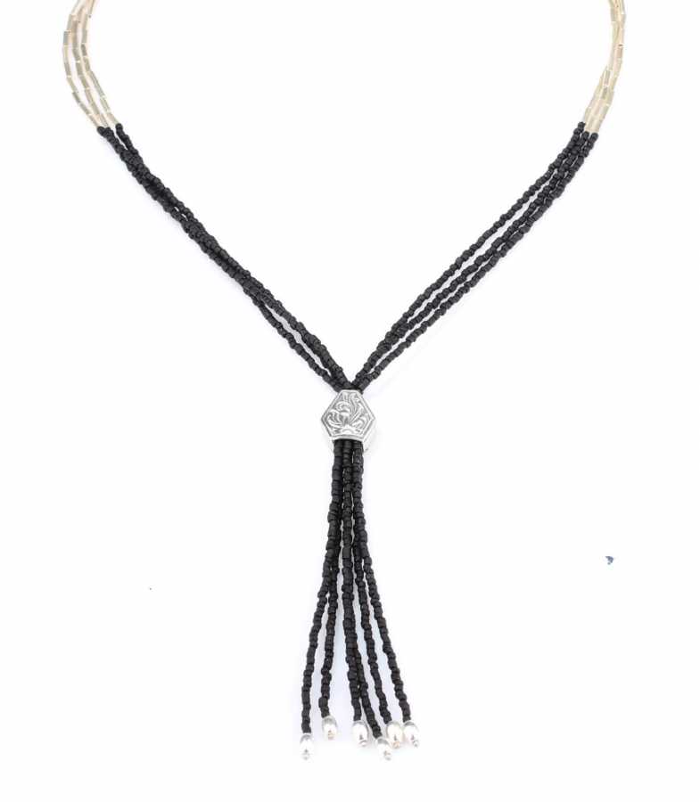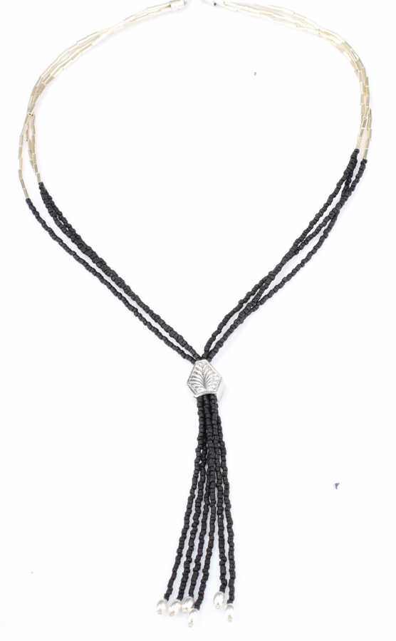 925 ayar gümüş ve oniks taşlı kolye, şarnel borularla dizilmiştiir.51 cm boyundadır. Ucundaki saçak kısmı 11 cm Gramı: 26 gr