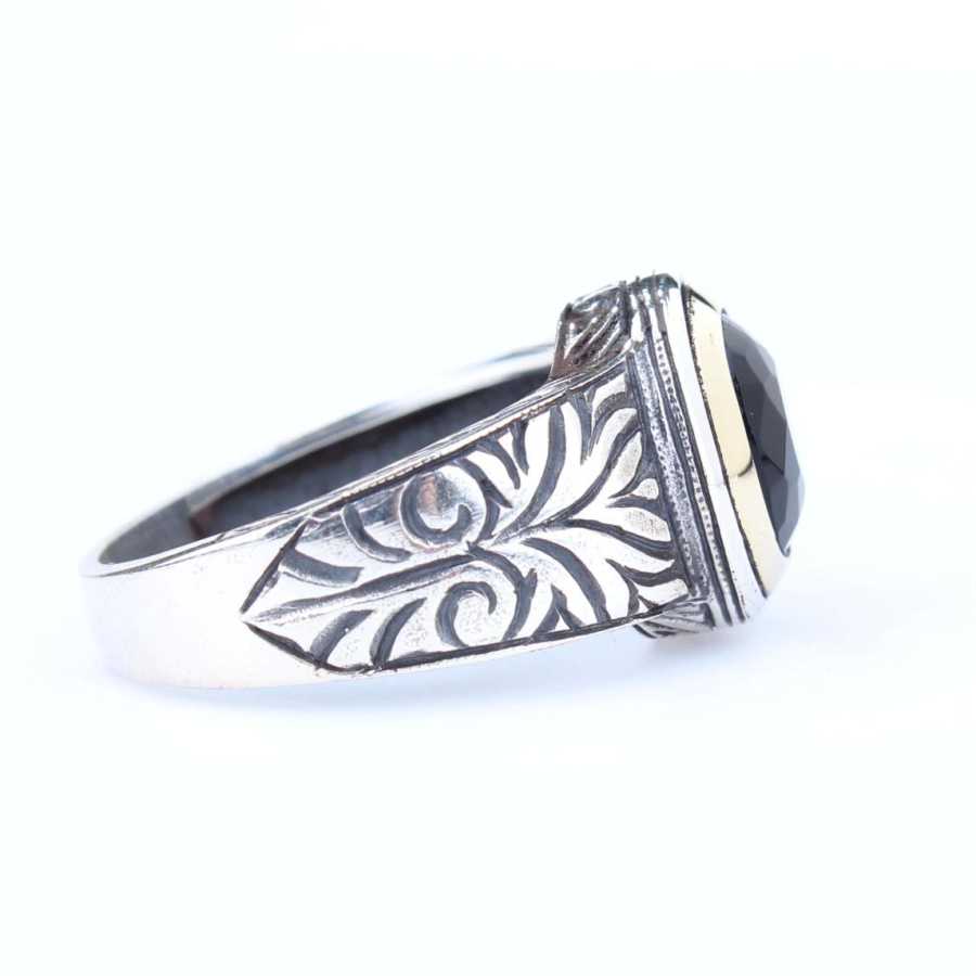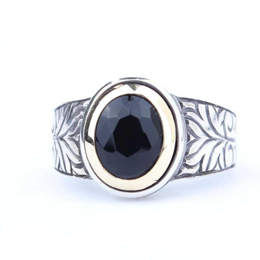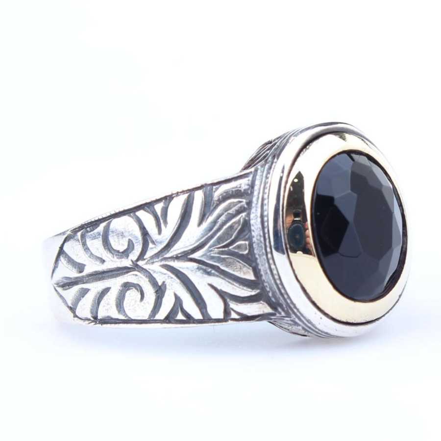 Yüzük 925 ayar gümüşten üretilmiştir. Taşlı yüzük 1,5 cm boyutlarındadır. Resimdeki yüzük 24 ölçüdür, ancak tüm ölçüler özel olarak yapılabilmektedir. Yüzük oniks renk taşlıdır. Ağırlığı 10,86 gramdır.