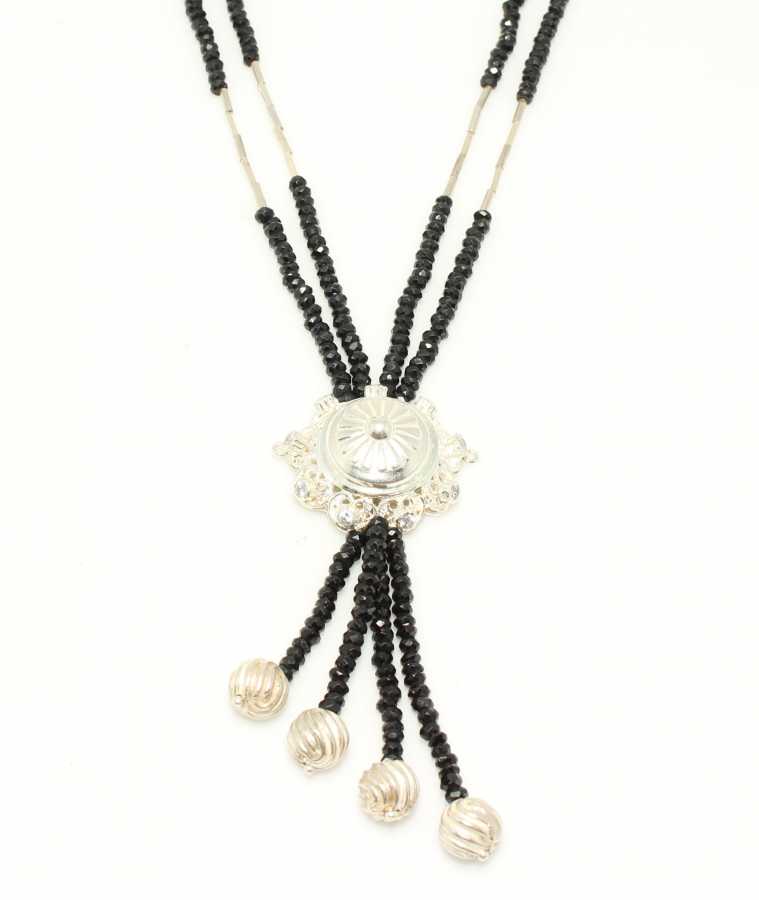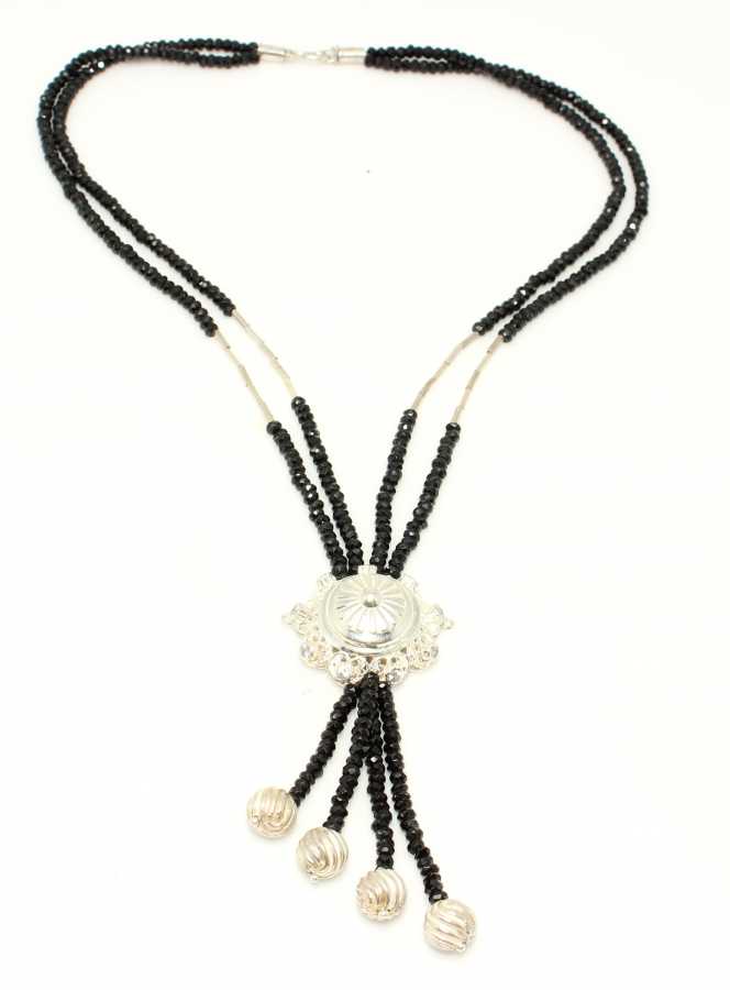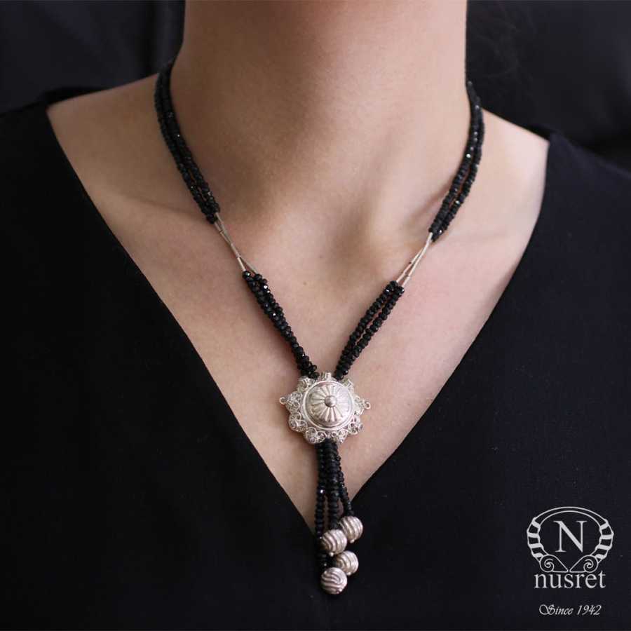 Gümüş kolye 925 ayar gümüşten yapılmıştır. Oniks taşların aralarına şarnel borular eklenerek 2 sıra dizilmiş kolye 45 cm uzunluğundadır. Kolye oniks taşlıdır. Kolyenin ortasındaki parça 2,8 cm boyutlarındadır. Ağırlığı 39,21 gramdır.