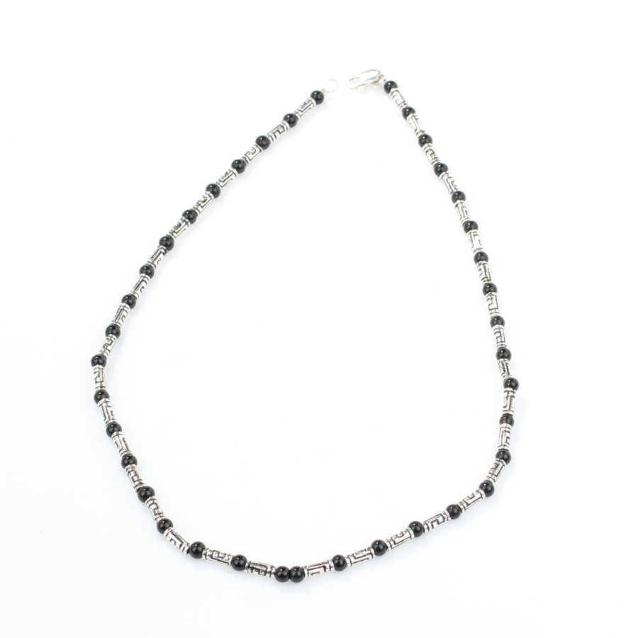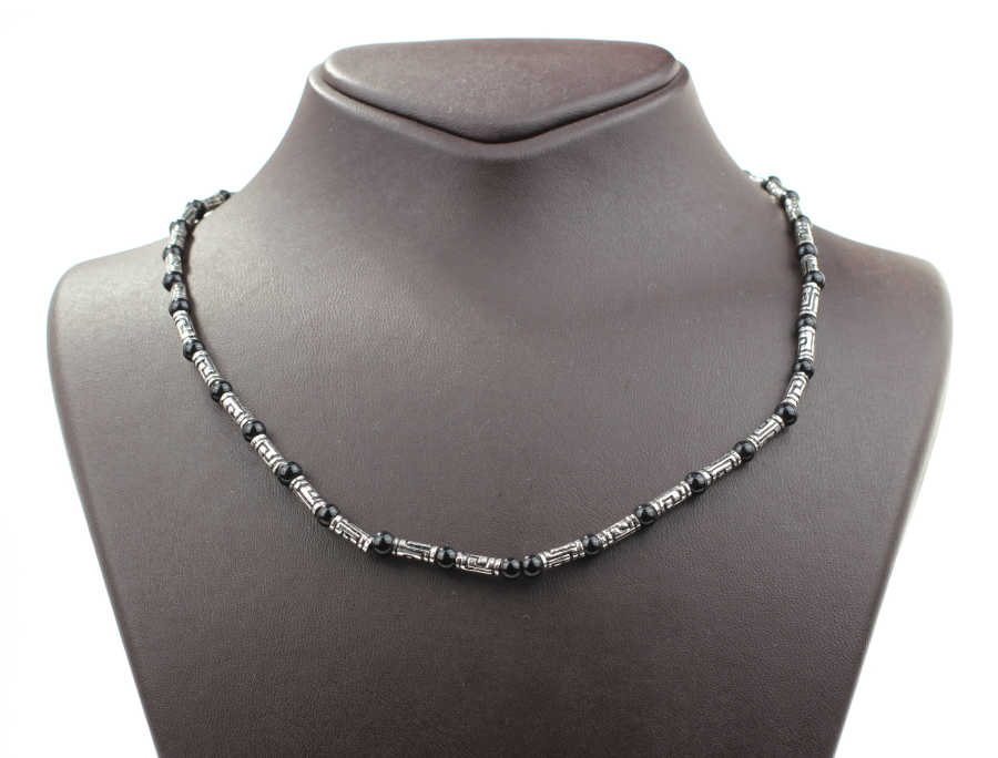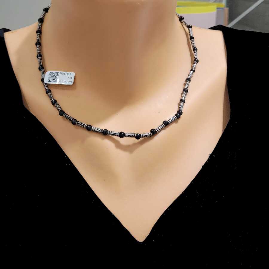 Gümüş kolye 925 ayar gümüşten yapılmıştır. Dizi kolye 42 cm uzunluğundadır. Kolye oniks taş ve gümüş şarnel borular eklenerek dizilmiştir. Ağırlığı 15,82 gramdır.