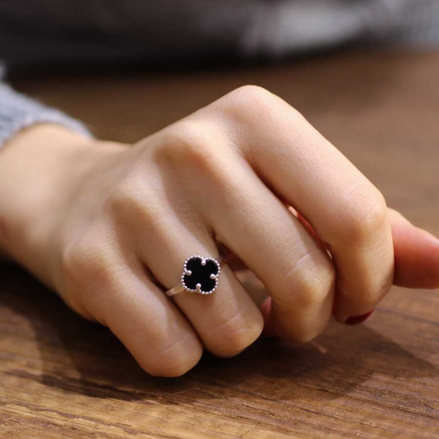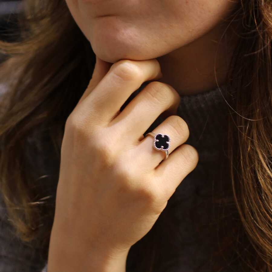 925 Ayar Gümüş Oniks Taşlı Yonca Model Yüzük