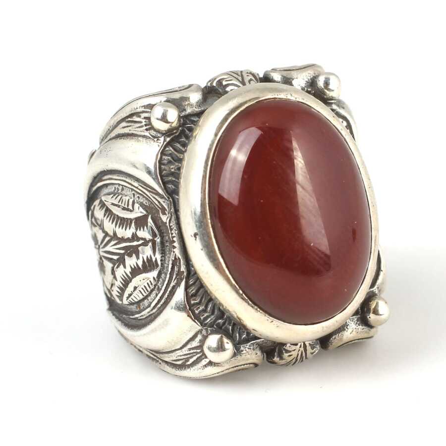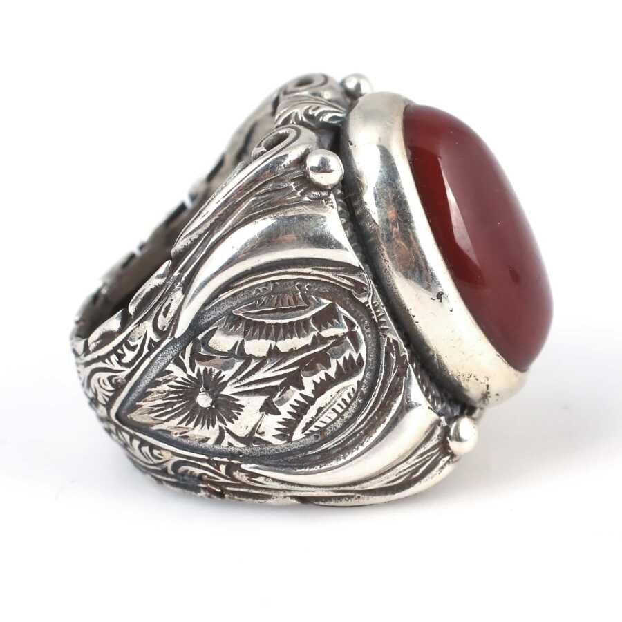 Yüzük 925 ayar gümüşten üretilmiştir. Taşlı yüzüğün üst kısmı 2,6 x 2,3 cm boyutlarındadır. Resimdeki yüzük 20 ölçüdür, ancak tüm ölçüler özel olarak yapılabilmektedir. Yüzük akik taşlıdır. Ağırlığı 24 gramdır.