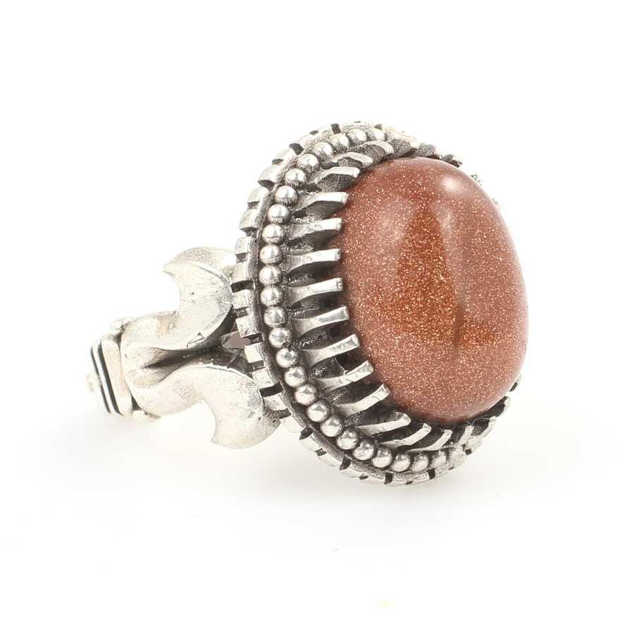Yüzük 925 ayar gümüşten üretilmiştir. Taşlı yüzük 2,2 cm'ye 1,9 cm boyutlarındadır. Resimdeki yüzük 25 ölçüdür, ancak tüm ölçüler özel olarak yapılabilmektedir. Yüzük kumtaşı taşlıdır. Ağırlığı 13,4 gramdır.