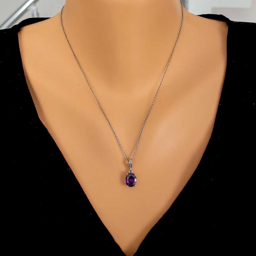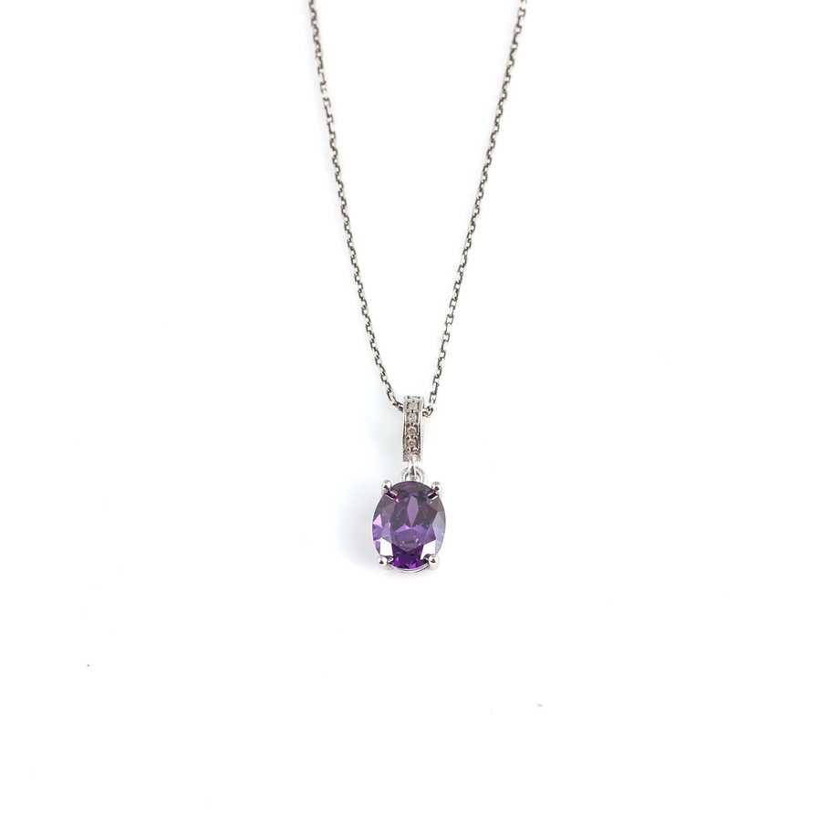 Gümüş kolye 925 ayar gümüşten yapılmıştır. Oval model kolye 1,0 cm'ye 0,8 cm boyutlarındadır. Gümüş kolye 45 cm uzunluğundadır. Kolye ametist renk zirkon taşlıdır. Gümüş renklidir. Ağırlığı 2,97 gramdır.