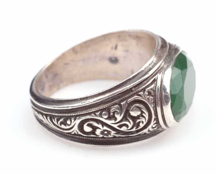 Yüzük 925 ayar gümüşten üretilmiştir. Taşlı yüzük 1,7 cm'ye 1,4 cm boyutlarındadır. Resimdeki yüzük 23 ölçüdür, ancak tüm ölçüler özel olarak yapılabilmektedir. Yüzük yeşil akik taşlıdır. Ağırlığı 12,06 gramdır.
