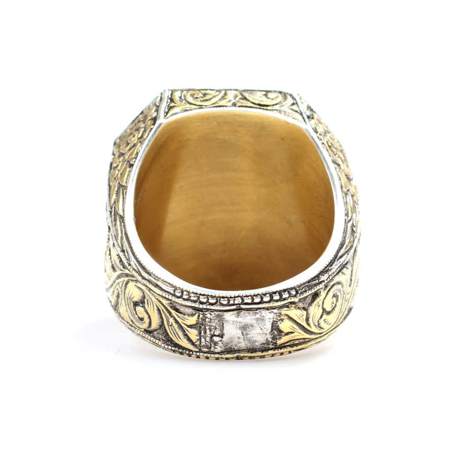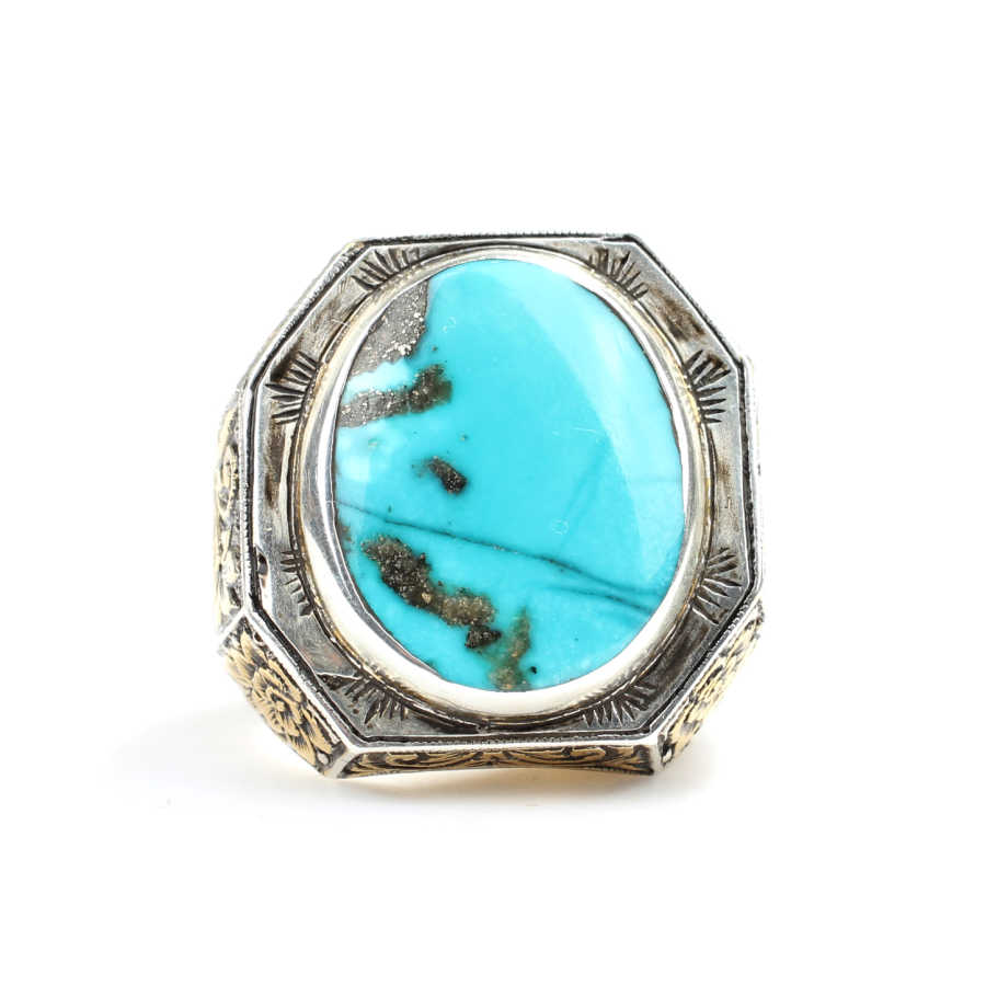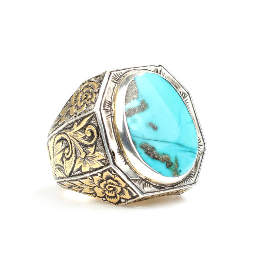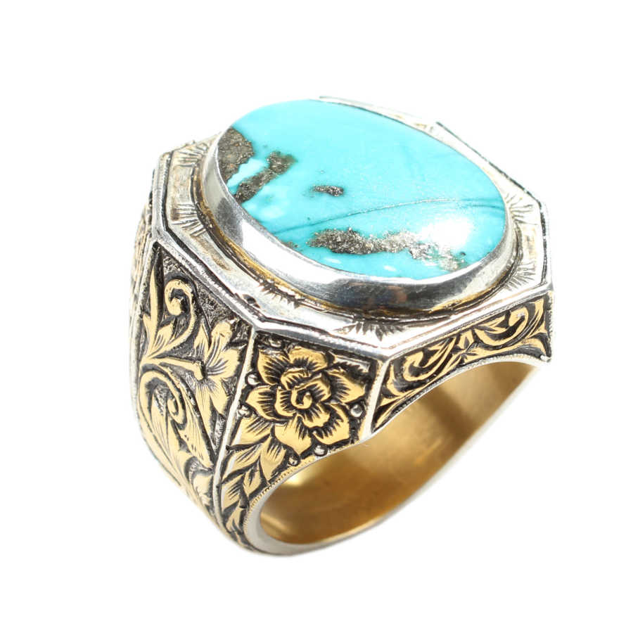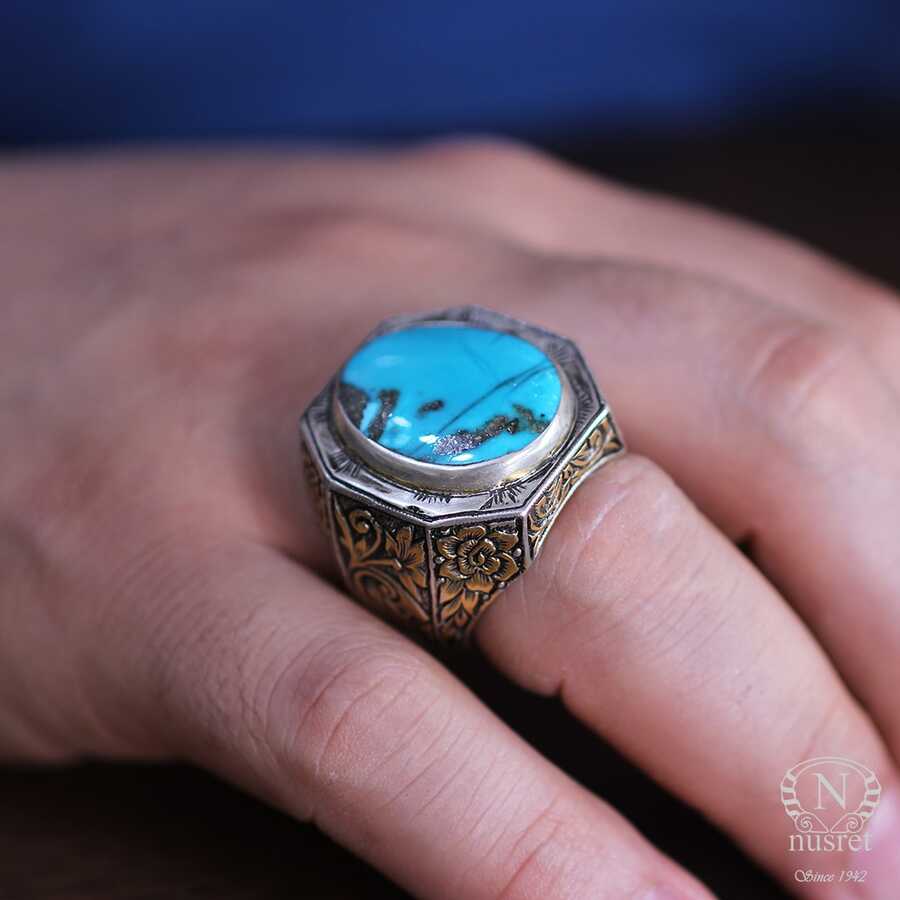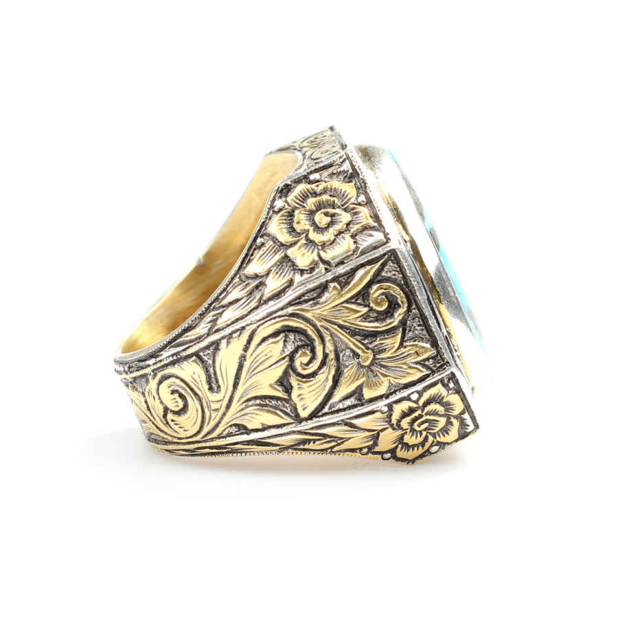 Yüzük 925 ayar gümüşten üretilmiştir. Yüzüğün üzerinde el kalemi atılarak tasarlanmıştır. Taşlı yüzük 2,6 cm boyutlarındadır. Resimdeki yüzük 24 ölçüdür, ancak tüm ölçüler özel olarak yapılabilmektedir. Yüzük has turkuaz taşlıdır. Ağırlığı 33,98 gramdır.