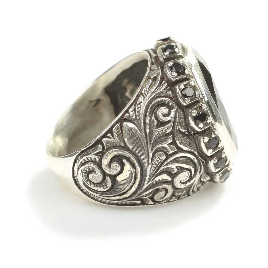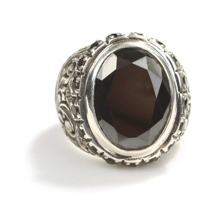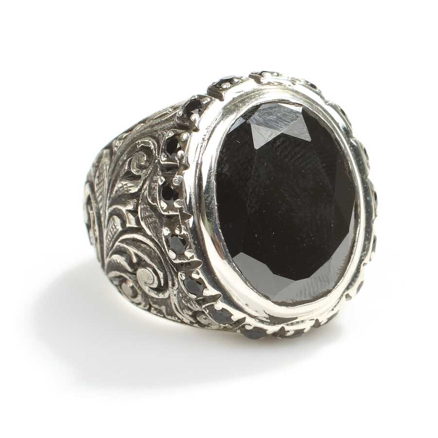 Yüzük 925 ayar gümüşten üretilmiştir Yüzüğün üzerinde el kalemi atılarak tasarlanmıştır. Taşlı yüzük 2,0 cm'ye 1,5 cm boyutlarındadır. Resimdeki yüzük 24 ölçüdür, ancak tüm ölçüler özel olarak yapılabilmektedir. Yüzük garnet taşlıdır. Ağırlığı 27,41 gramdır.