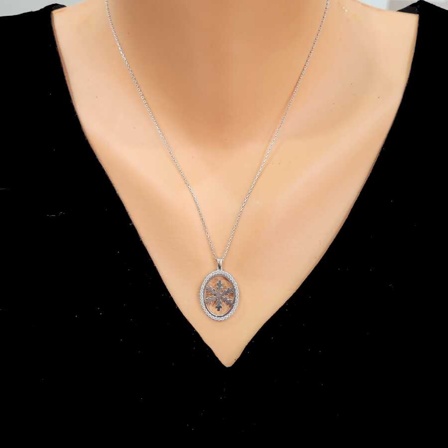 Gümüş kolye 925 ayar gümüşten yapılmıştır. Oval kar tanesi model kolye 2,7 cm'ye 1,7 cm boyutlarındadır. Zinciri 41 cm uzunluğundadır. Kolye zirkon taşlıdır. Ağırlığı 2,5 gramdır.
