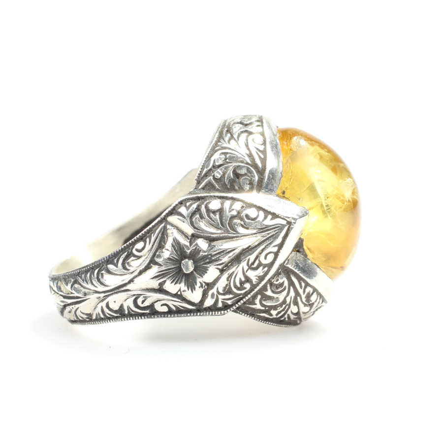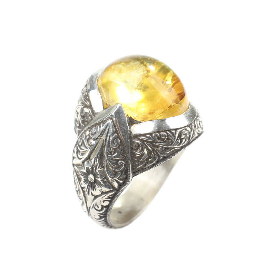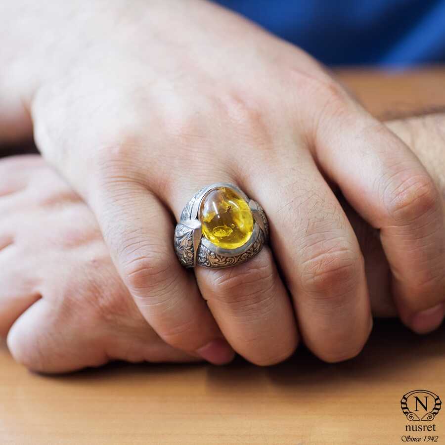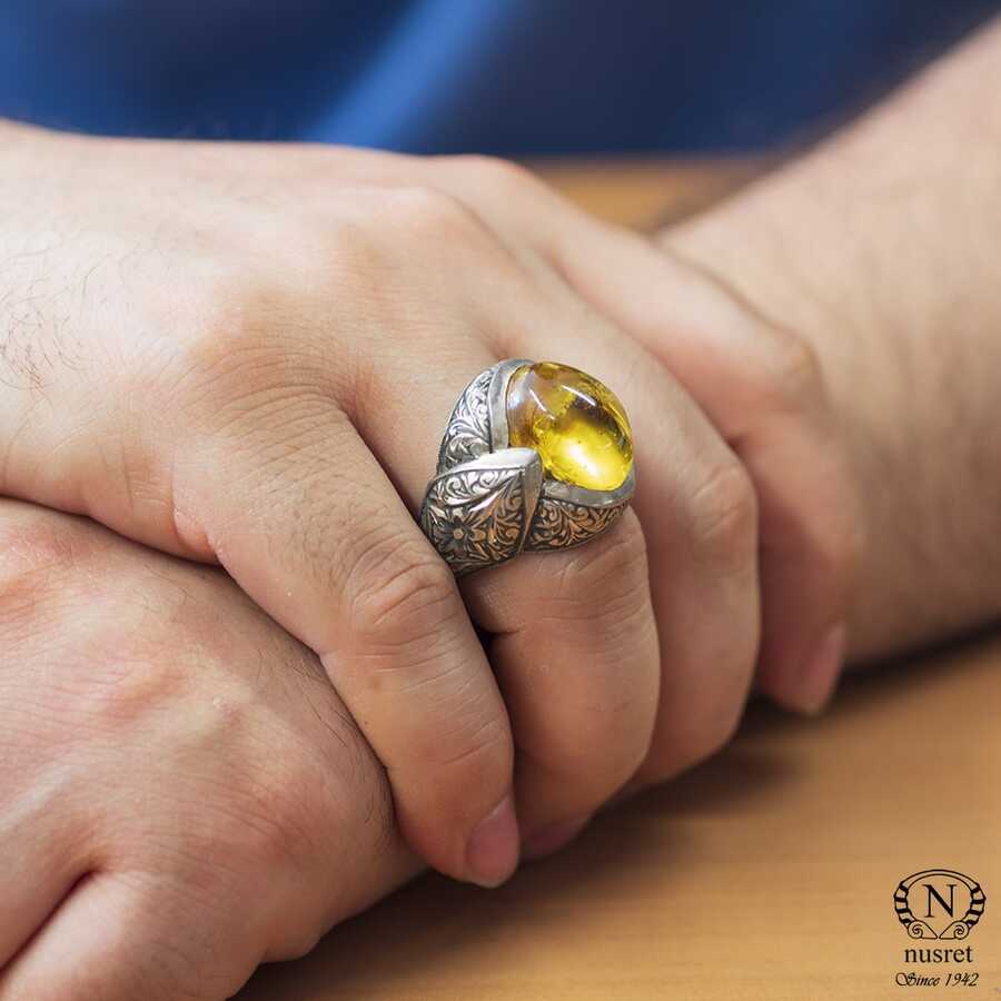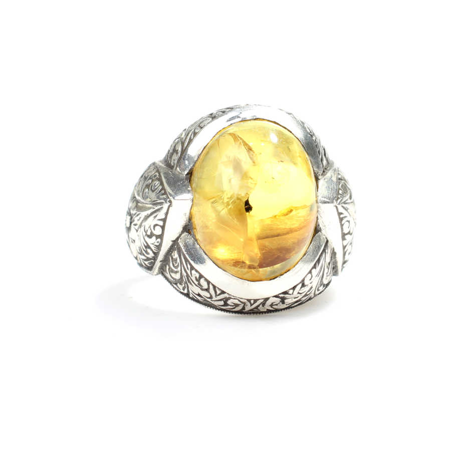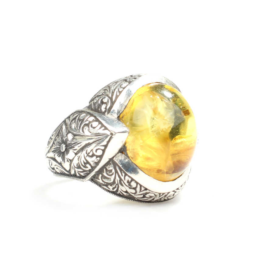 Yüzük 925 ayar gümüşten üretilmiştir. Yüzüğün üzerinde el kalemi atılarak tasarlanmıştır. Taşlı yüzük 2,7 cm'ye 2,5 cm boyutlarındadır. Resimdeki yüzük 33 ölçüdür, ancak tüm ölçüler özel olarak yapılabilmektedir. Yüzük sıkma kehribar taşlıdır. Ağırlığı 19,07 gramdır.