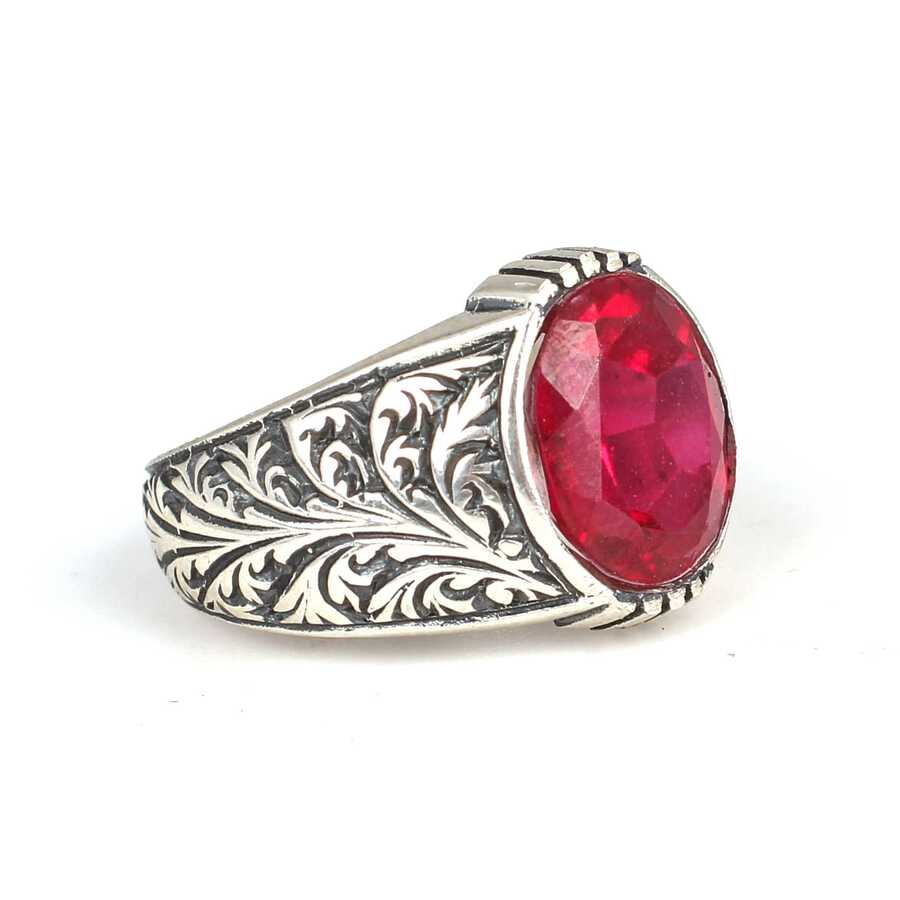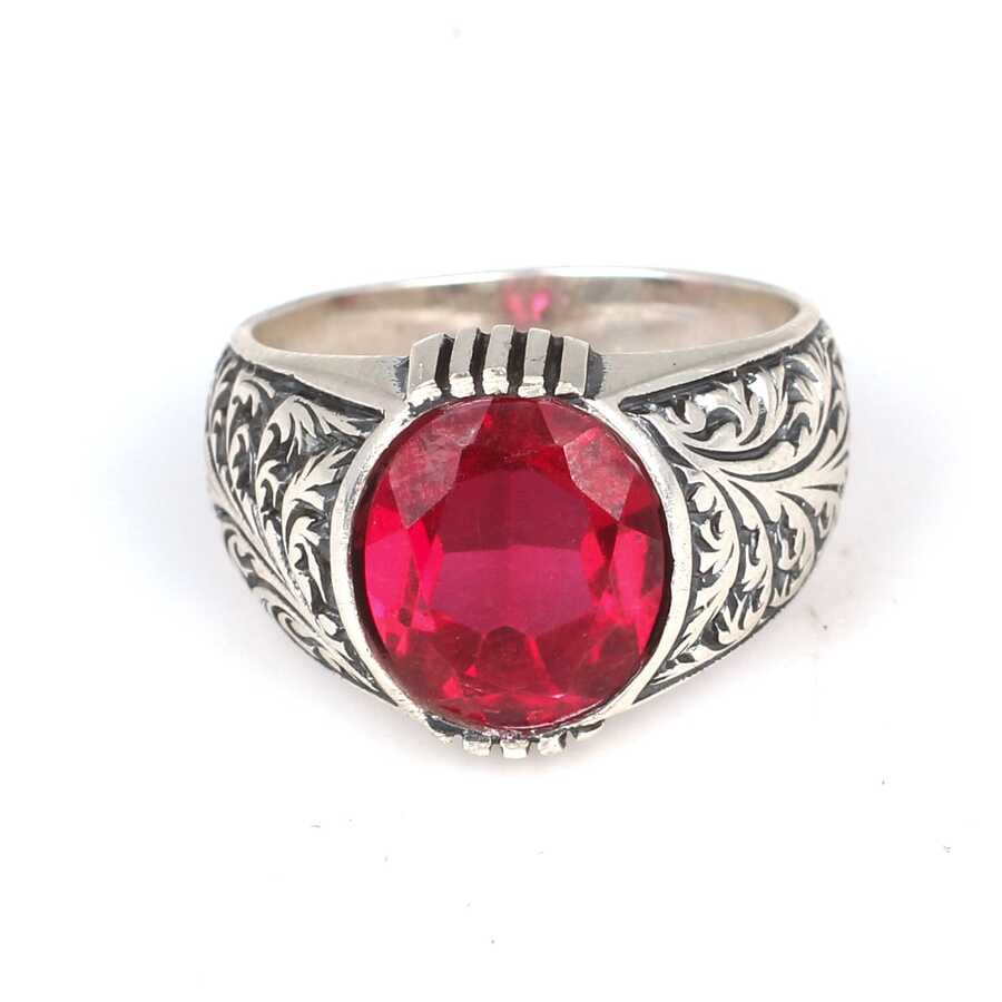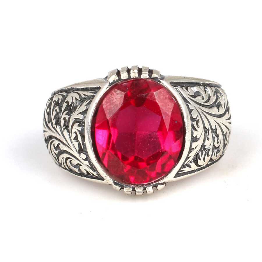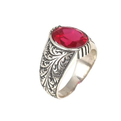 WGEYZ1702 - 925 Ayar Gümüş Oval Kırmızı Taşlı Erkek Yüzüğü