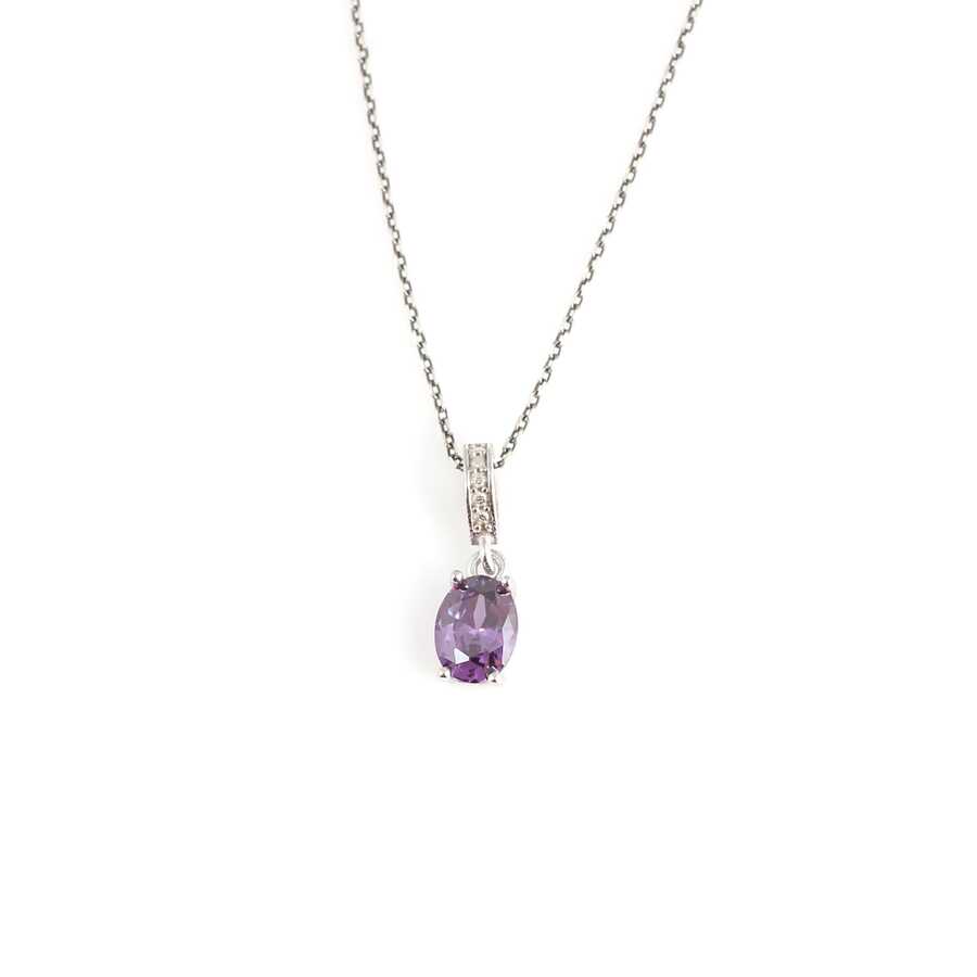 Gümüş kolye 925 ayar gümüşten yapılmıştır. Oval model kolye 0,6 cm'ye 0,8 cm boyutlarındadır. Gümüş kolye 45 cm uzunluğundadır. Kolye ametist renk zirkon taşlıdır. Gümüş renklidir. Ağırlığı 2,27 gramdır.