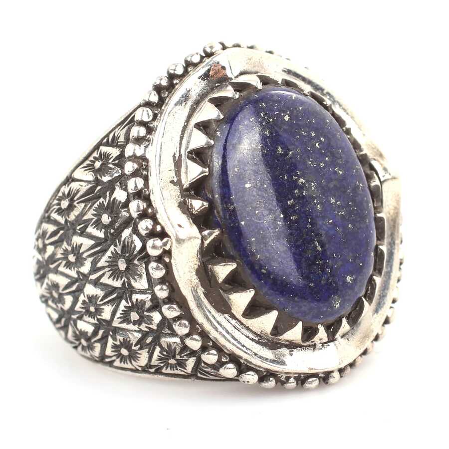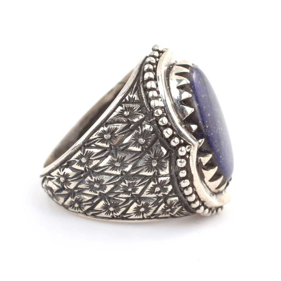 Yüzük 925 ayar gümüşten üretilmiştir. Yüzüğün üzerinde el kalemi atılarak tasarlanmıştır. Taşlı yüzük 2,1 cm'ye 1,7 cm boyutlarındadır. Resimdeki yüzük 24 ölçüdür, ancak tüm ölçüler özel olarak yapılabilmektedir. Yüzük lapis renk taşlıdır. Ağırlığı 24,77 gramdır.