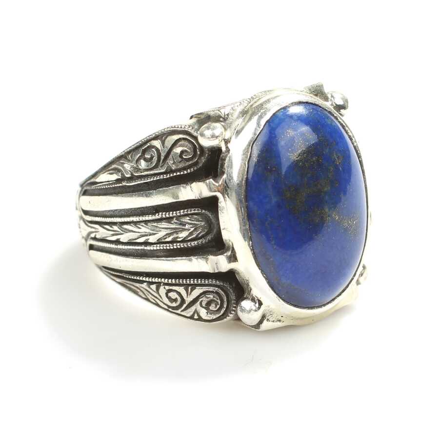 Yüzük 925 ayar gümüşten üretilmiştir. Yüzüğün üzerinde el kalemi atılarak tasarlanmıştır. Taşlı yüzük 2,0 cm'ye 1,5 cm boyutlarındadır. Resimdeki yüzük 24 ölçüdür, ancak tüm ölçüler özel olarak yapılabilmektedir. Yüzük lapis renk taşlıdır. Ağırlığı 22,4 gramdır.