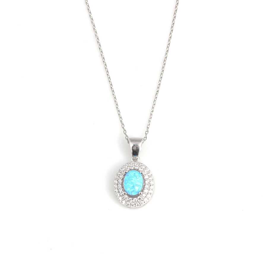 Gümüş kolye 925 ayar gümüşten yapılmıştır. Oval taşlı anturaj model kolye 1,5 cm'ye 1,3 cm boyutlarındadır. Opal taşı 0,6 cm'ye 0,8 cm boyutlarındadır. Gümüş kolye 45 cm uzunluğundadır. Kolye beyaz zirkon ve mavi renk opal taşlıdır. Ağırlığı 3,15 gramdır.