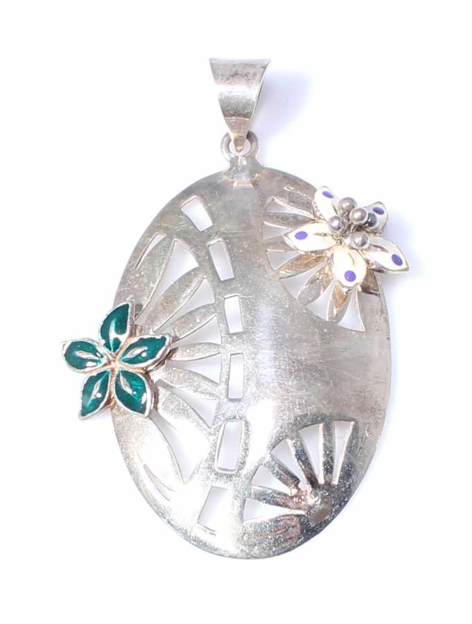 Kolye ucu 925 ayar gümüşten imal edilmiştir. Oval dışa bombeli parça üzerinde çiçek şekilleri vardır. Kolye ucu 3,0 cm'ye 5,0 cm boyutlarındadır. Zincir dahil değildir. Kolye ucu üzerinde taş yoktur. Kolye ucu 4,95 gram ağırlığındadır.