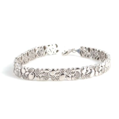 Bileklik 925 ayar gümüşten imal edilmiştir. Füzyon model bileklik 19 cm uzunluğundadır. Oval model bileklik 0,8 cm enindedir. Bileklik zirkon taşlıdır. Gümüş bileklik 9,29 gram ağırlığındadır