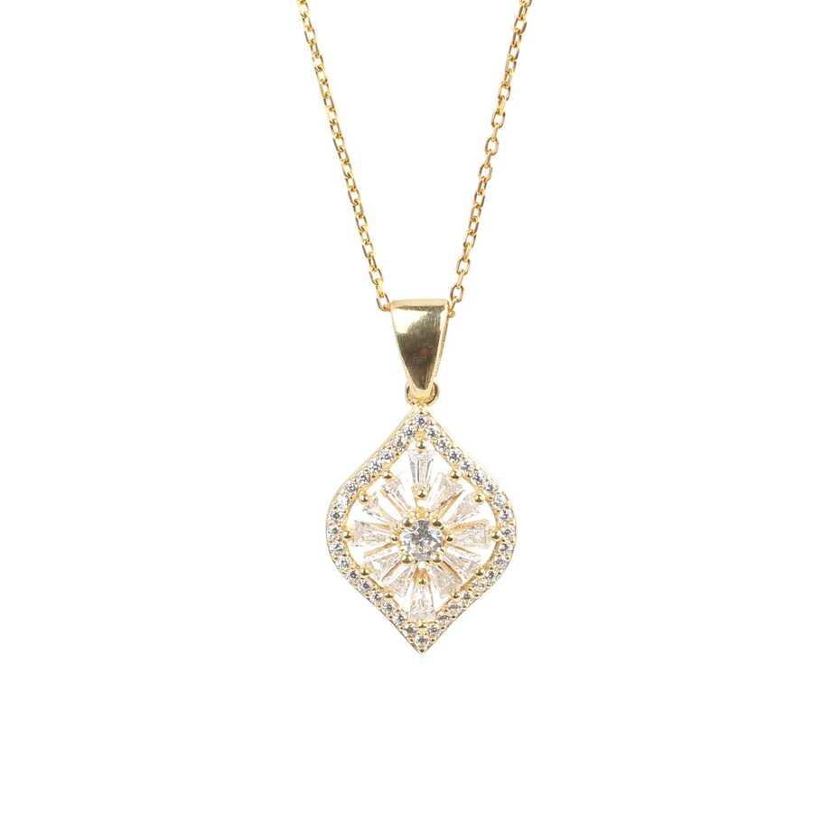 Gümüş kolye 925 ayar gümüşten yapılmıştır. Badem şeklinde ve içinde minik baget taşlar eklenen kolye 1,9 cm'ye 1,4 cm boyutlarındadır. Gümüş kolye 45 cm uzunluğundadır. Kolye beyaz zirkon taşlıdır. Ağırlığı 3,2 gramdır.