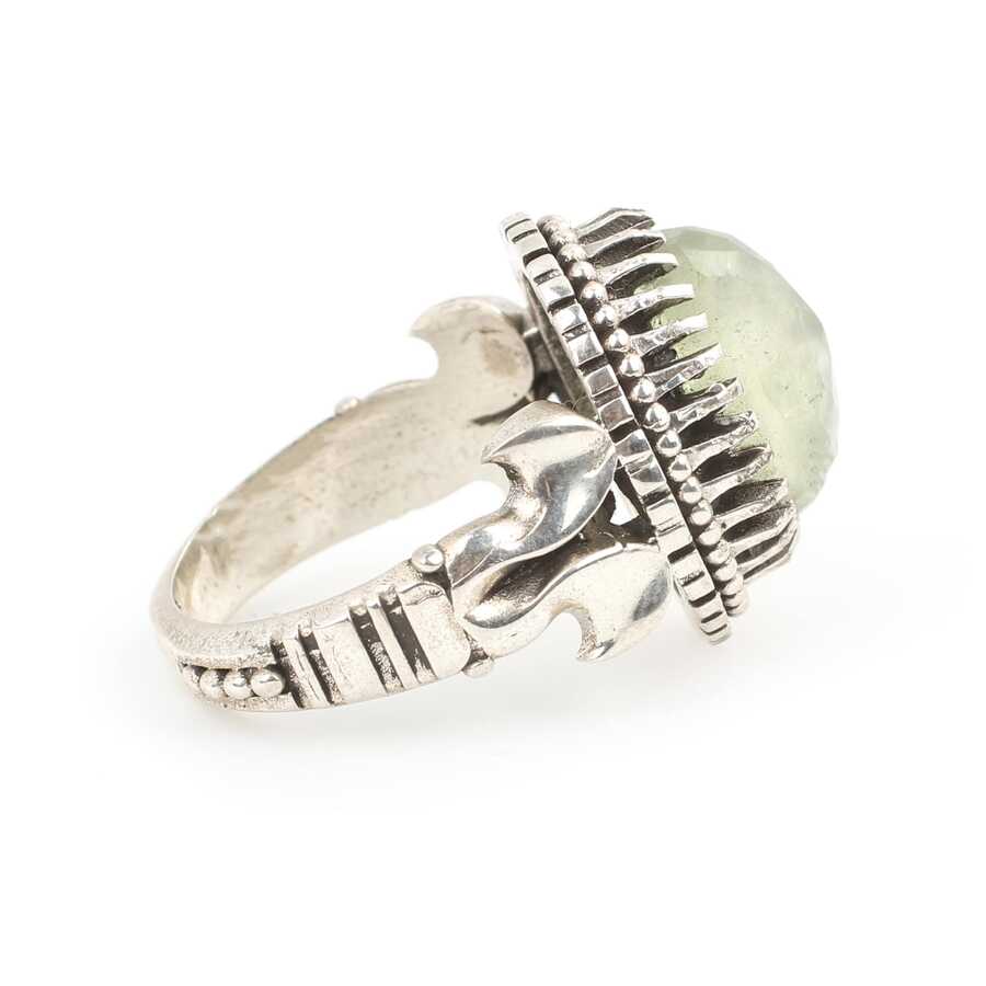 Yüzük 925 ayar gümüşten üretilmiştir. Taşlı yüzük 2,2 cm'ye 1,9 cm boyutlarındadır. Resimdeki yüzük 25 ölçüdür, ancak tüm ölçüler özel olarak yapılabilmektedir. Yüzük prehnite taşlıdır. Ağırlığı 13,2 gramdır.