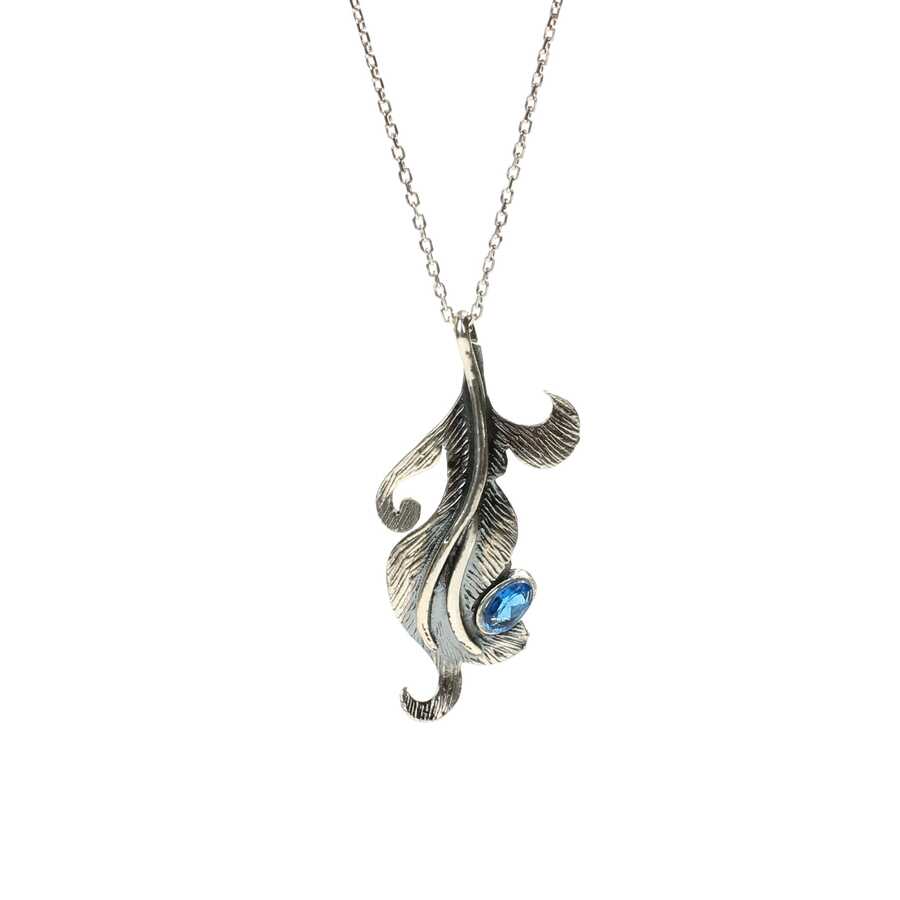 Gümüş kolye 925 ayar gümüşten yapılmıştır. Yaprak kolye 3,5 cm'ye 1,5 cm boyutlarındadır. Zinciri 45 cm uzunluğundadır. Kolye safir renk zirkon taşlıdır. Ağırlığı 3,24 gramdır.