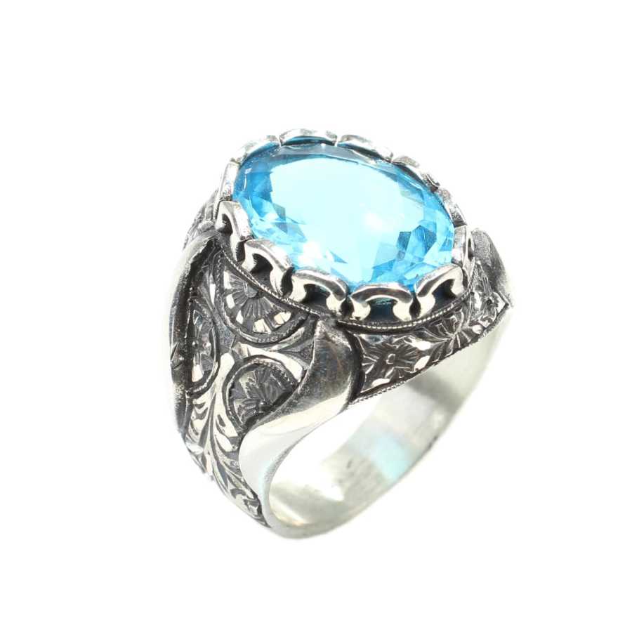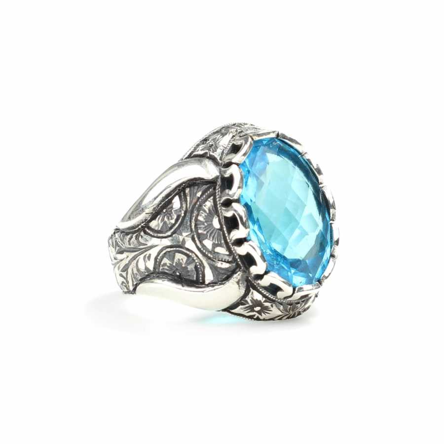 Yüzük 925 ayar gümüşten üretilmiştir. Yüzüğün üzerinde el kalemi atılarak tasarlanmıştır. Taşlı yüzük 2,6 cm'ye 2,1 cm boyutlarındadır. Resimdeki yüzük 26 ölçüdür, ancak tüm ölçüler özel olarak yapılabilmektedir. Yüzük akuamarin renk taşlıdır. Ağırlığı 16,52 gramdır.