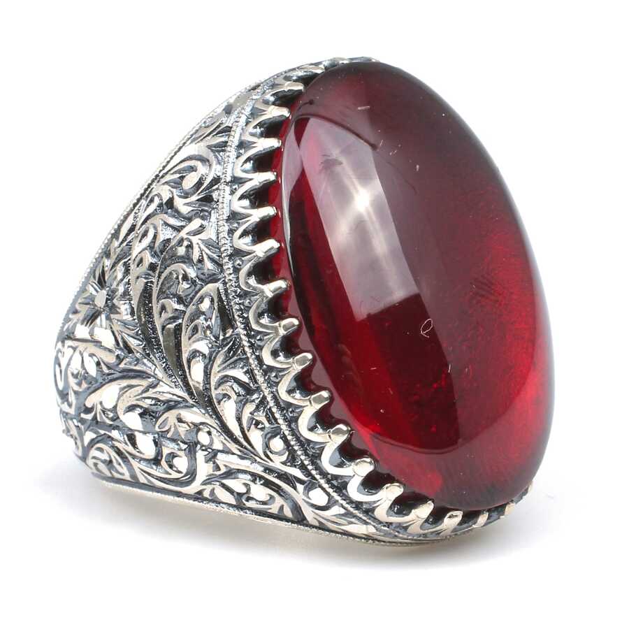 Yüzük 925 ayar gümüşten üretilmiştir. Yüzüğün üzerinde el kalemi atılarak tasarlanmıştır. Taşlı yüzük 3,0 cm'ye 2,2 cm boyutlarındadır. Resimdeki yüzük 27 ölçüdür, ancak tüm ölçüler özel olarak yapılabilmektedir. Yüzük sıkma kehribar taşlıdır. Ağırlığı 43,37 gramdır.