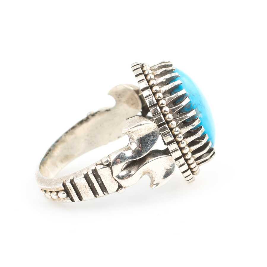 Yüzük 925 ayar gümüşten üretilmiştir. Taşlı yüzük 2,2 cm'ye 1,9 cm boyutlarındadır. Resimdeki yüzük 25 ölçüdür, ancak tüm ölçüler özel olarak yapılabilmektedir. Yüzük turkuaz taşlıdır. Ağırlığı 12,85 gramdır.