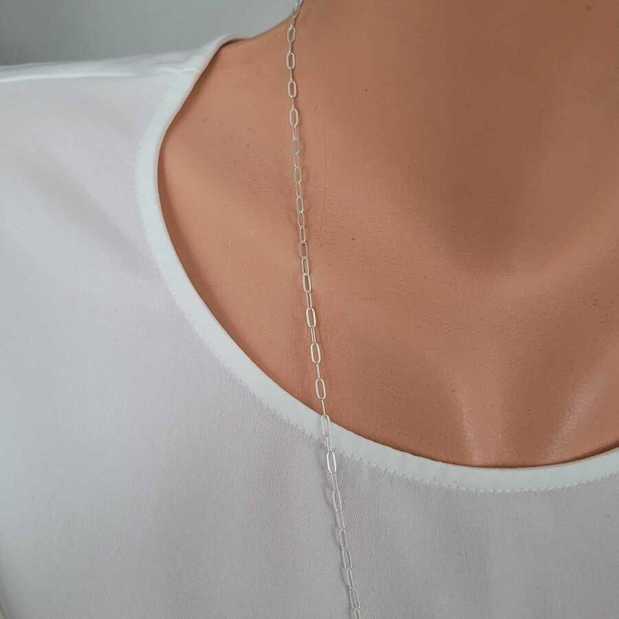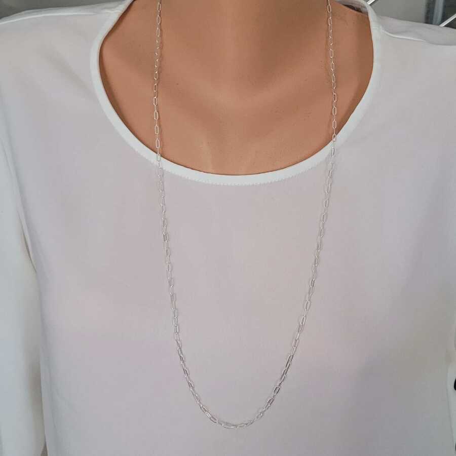 Gümüş kolye 925 ayar gümüşten yapılmıştır. Oval model zincir kolye 76 cm uzunluğundadır. Kolye taşsızdır. Ağırlığı 4,03 gramdır.