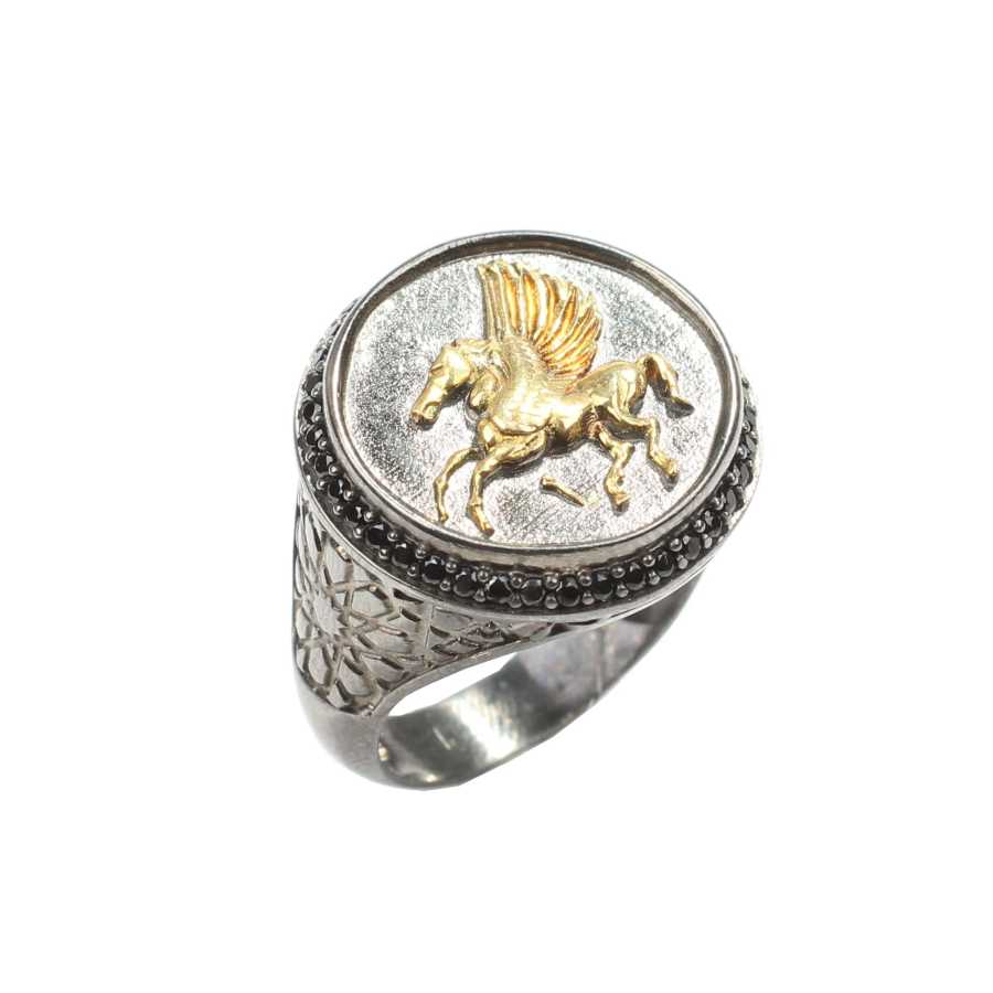 Yüzük 925 ayar gümüşten üretilmiştir. Taşlı yüzük 2,1 cm boyutlarındadır. Yüzüğün üst kısmında sarı renk Pegasus uçan at sembolü vardır. Resimdeki yüzük 22 ölçüdür, ancak tüm ölçüler özel olarak yapılabilmektedir. Yüzük zirkon taşlıdır. Ağırlığı 8,84 gramdır.