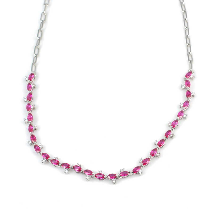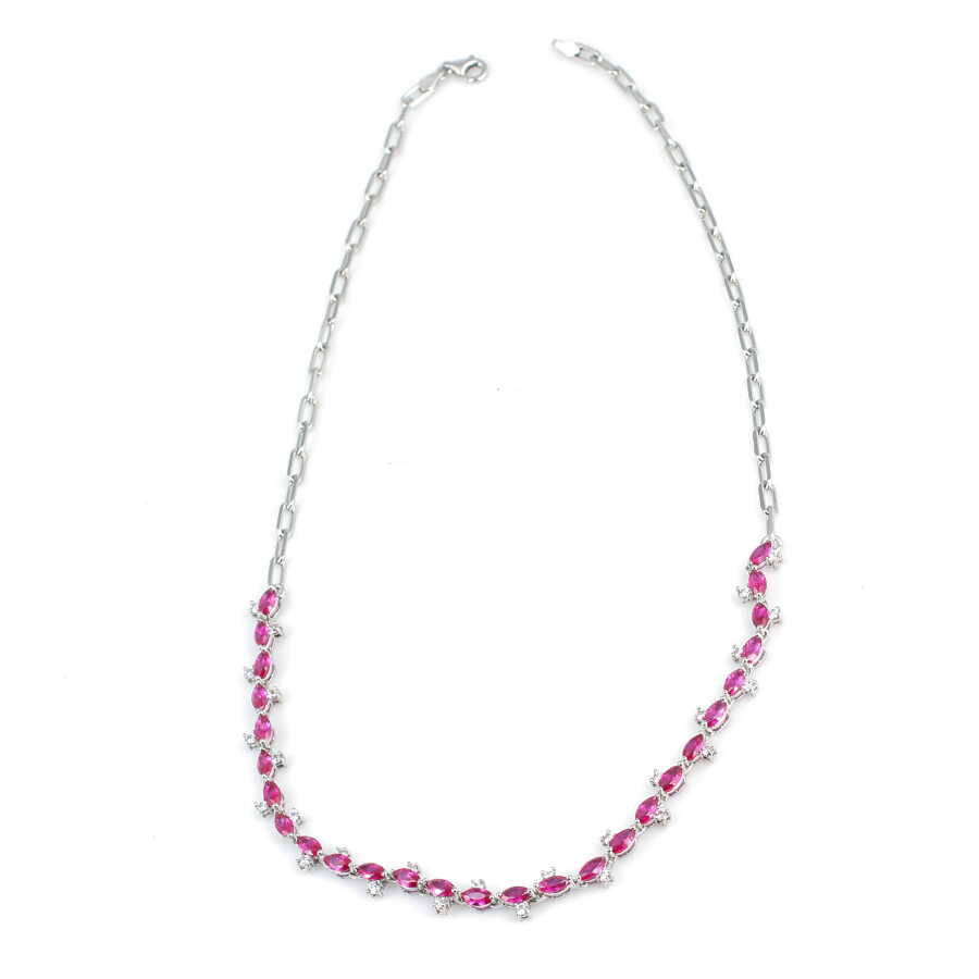 Gümüş kolye 925 ayar gümüşten yapılmıştır. Gümüş fantezi kolye 45 cm uzunluğundadır. Kalın forse zincir kullanılmıştır. Su yolu kolye 0,5 cm enindedir. Kolye pembe ve beyaz renk zirkon taşlıdır. Ağırlığı 22,23 gramdır.