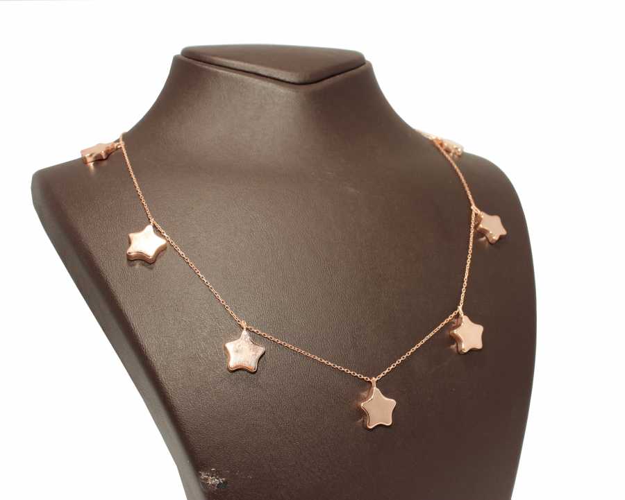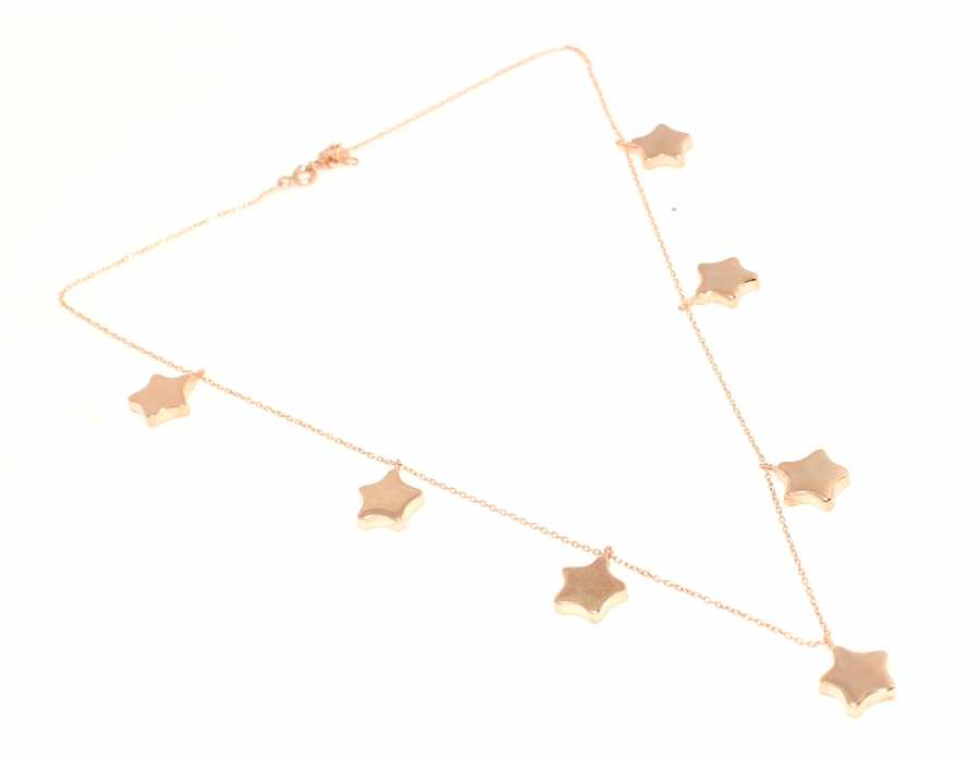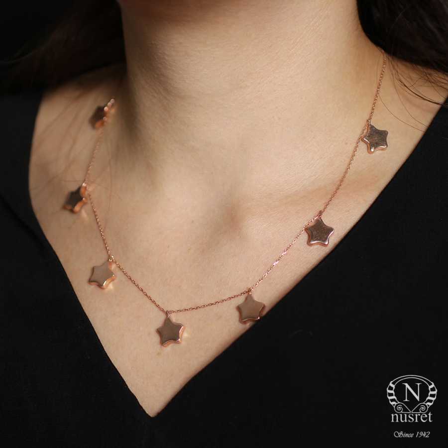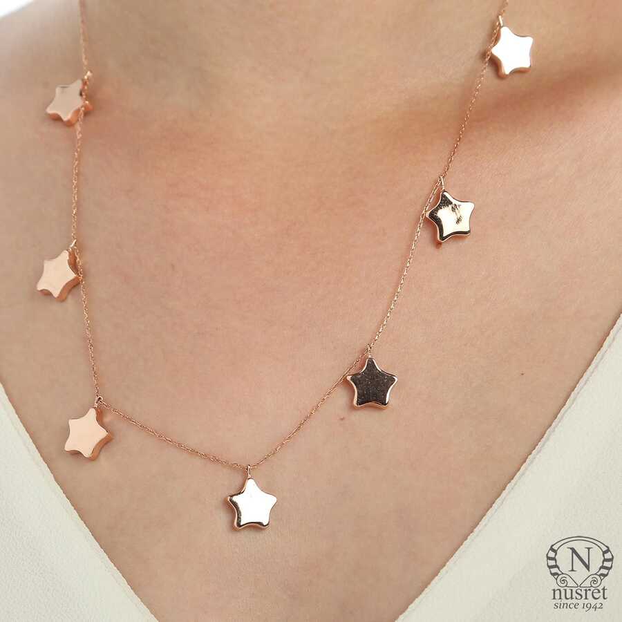 Gümüş kolye 925 ayar gümüşten yapılmıştır. Yıldız kolye 46 cm uzunluğundadır. Kolye ucunda 7 adet 1 cm boyutunda yıldız sallanmaktadır. Kolye taşsızdır. Rose renk rodajlıdır. Ağırlığı 7,21 gramdır.