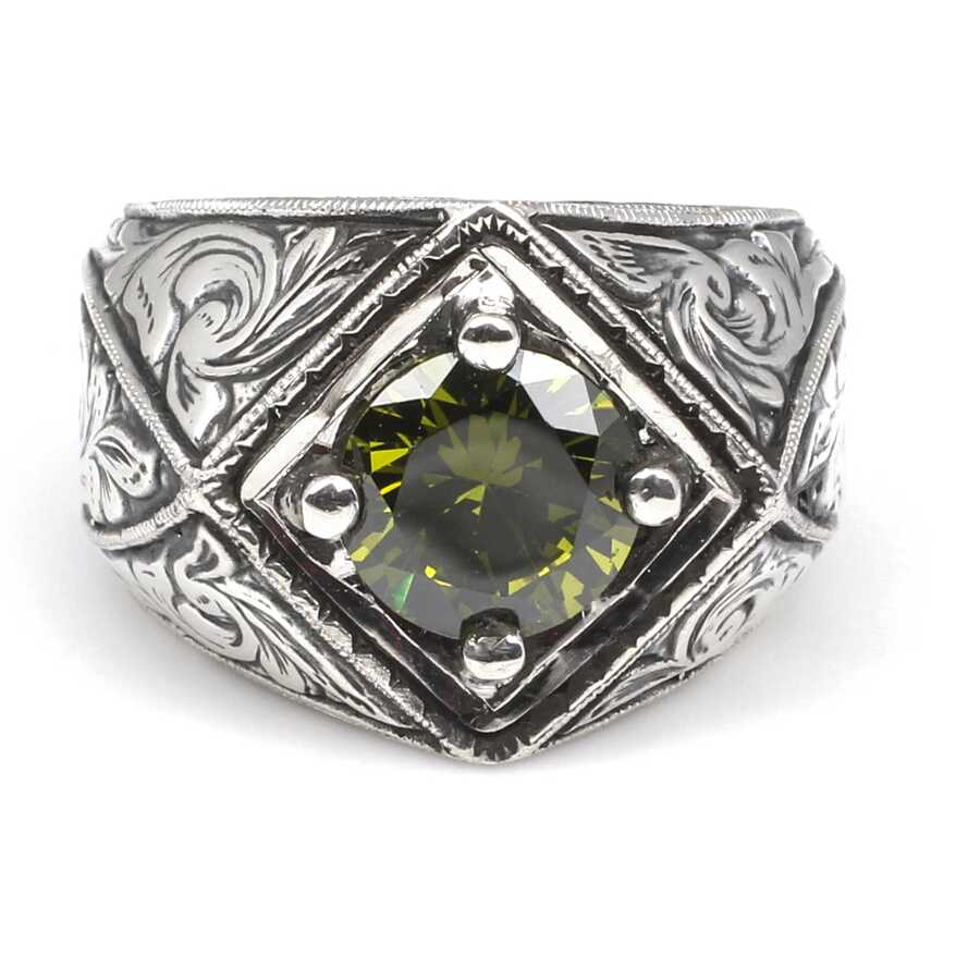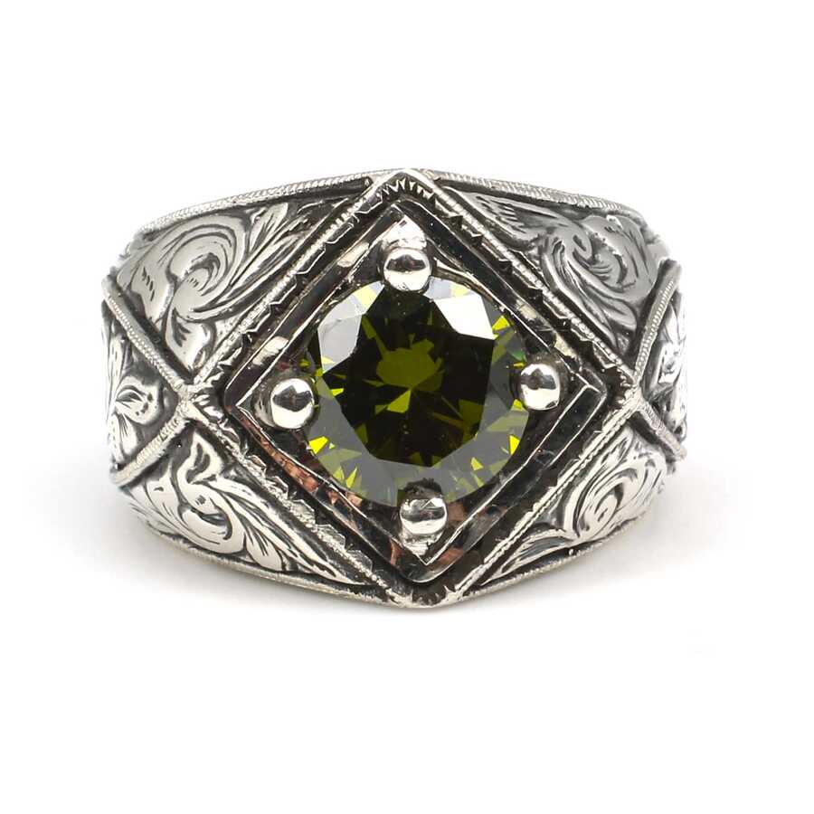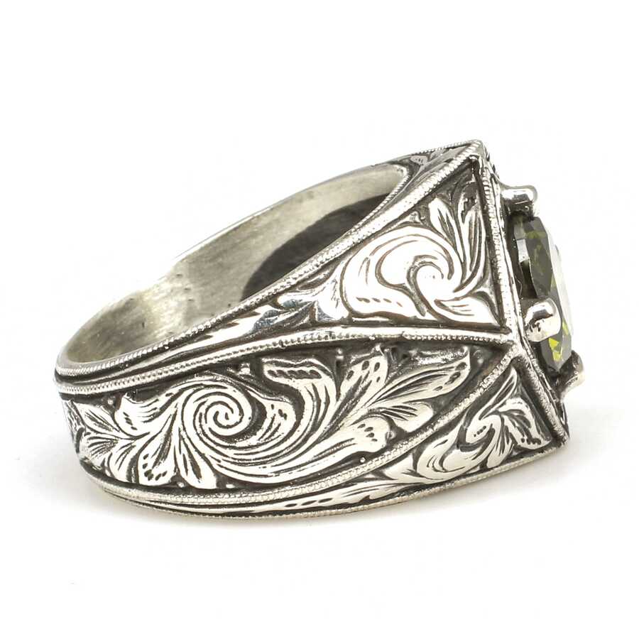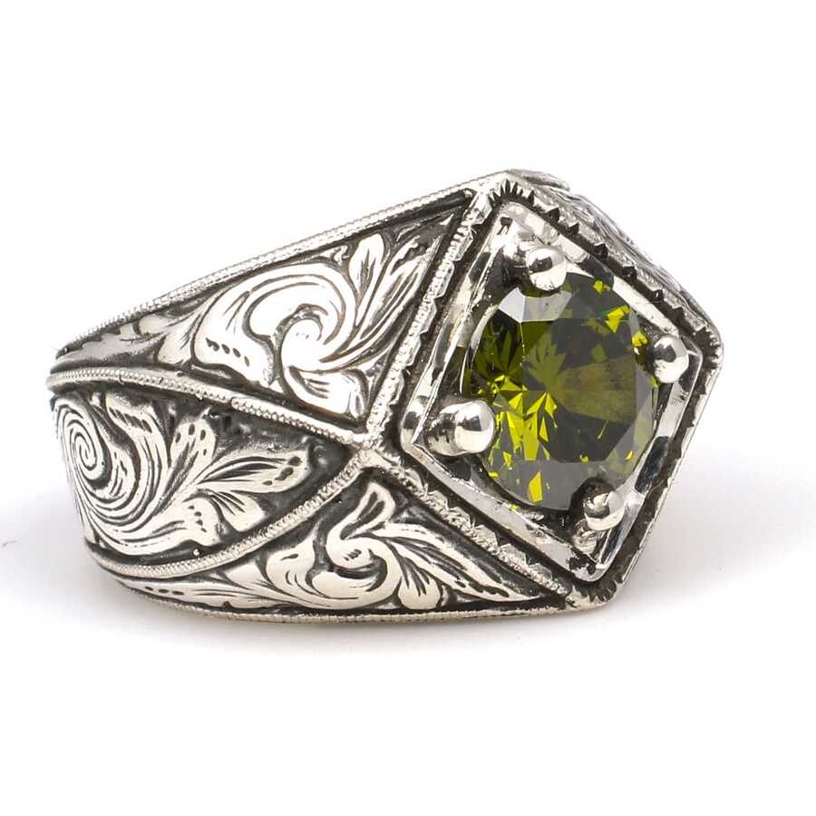 Yüzük 925 ayar gümüşten üretilmiştir. Yüzüğün üzerinde el kalemi atılarak tasarlanmıştır. Taşlı yüzük 2,6 cm'ye 1,9 cm boyutlarındadır. Resimdeki yüzük 25 ölçüdür, ancak tüm ölçüler özel olarak yapılabilmektedir. Yüzük peridot taşlıdır. Ağırlığı 23,05 gramdır.