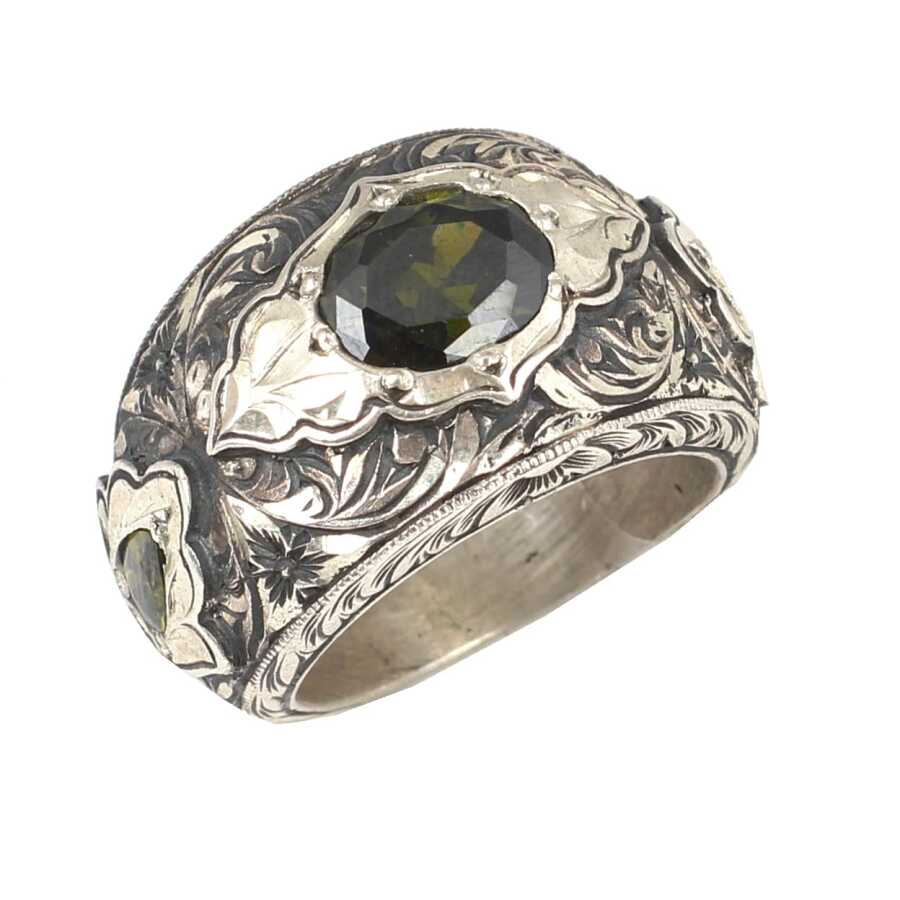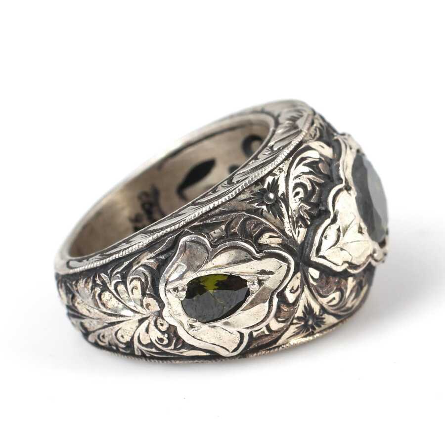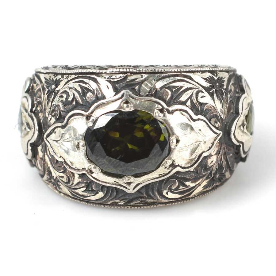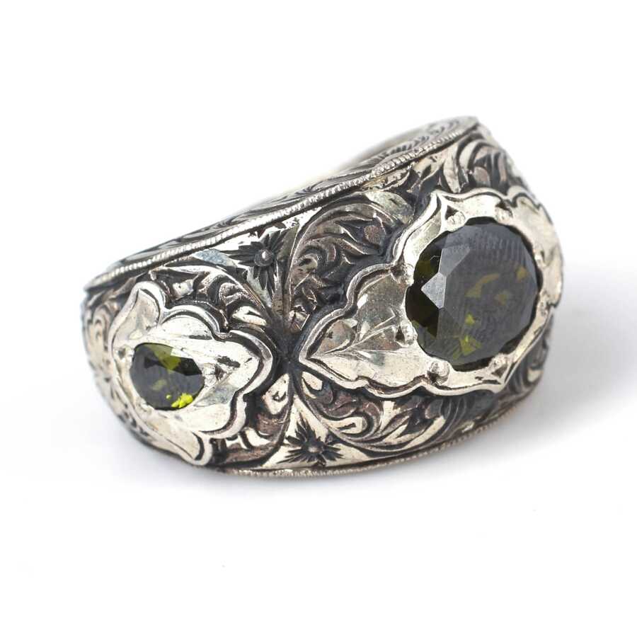 Yüzük 925 ayar gümüşten üretilmiştir. Taşlı yüzüğün üst kısmı 1,7 cm boyutlarındadır. Resimdeki yüzük 22 ölçüdür, ancak tüm ölçüler özel olarak yapılabilmektedir. Yüzük peridot taşlıdır. Ağırlığı 18,22 gramdır.