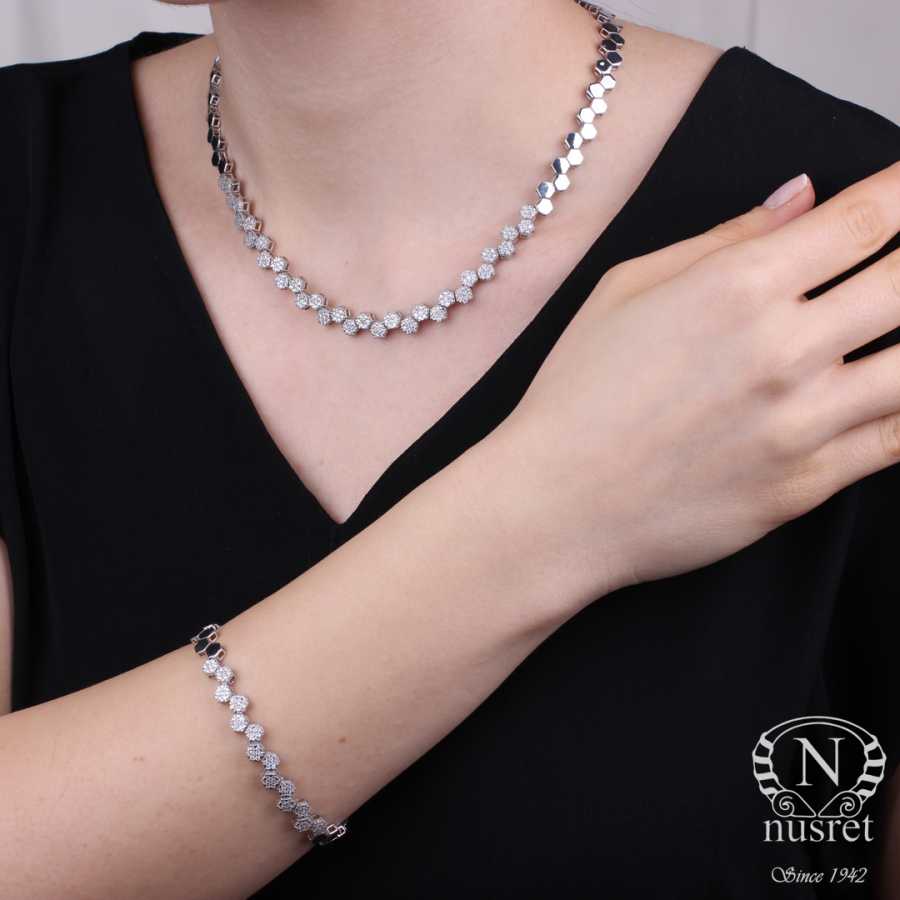 Gümüş kolye 925 ayar gümüşten yapılmıştır. Gümüş kolye 45 cm uzunluğundadır. Petek şeklindeki pırlanta görünümündeki kolye zirkon taşlıdır. Ağırlığı 32,22 gramdır.